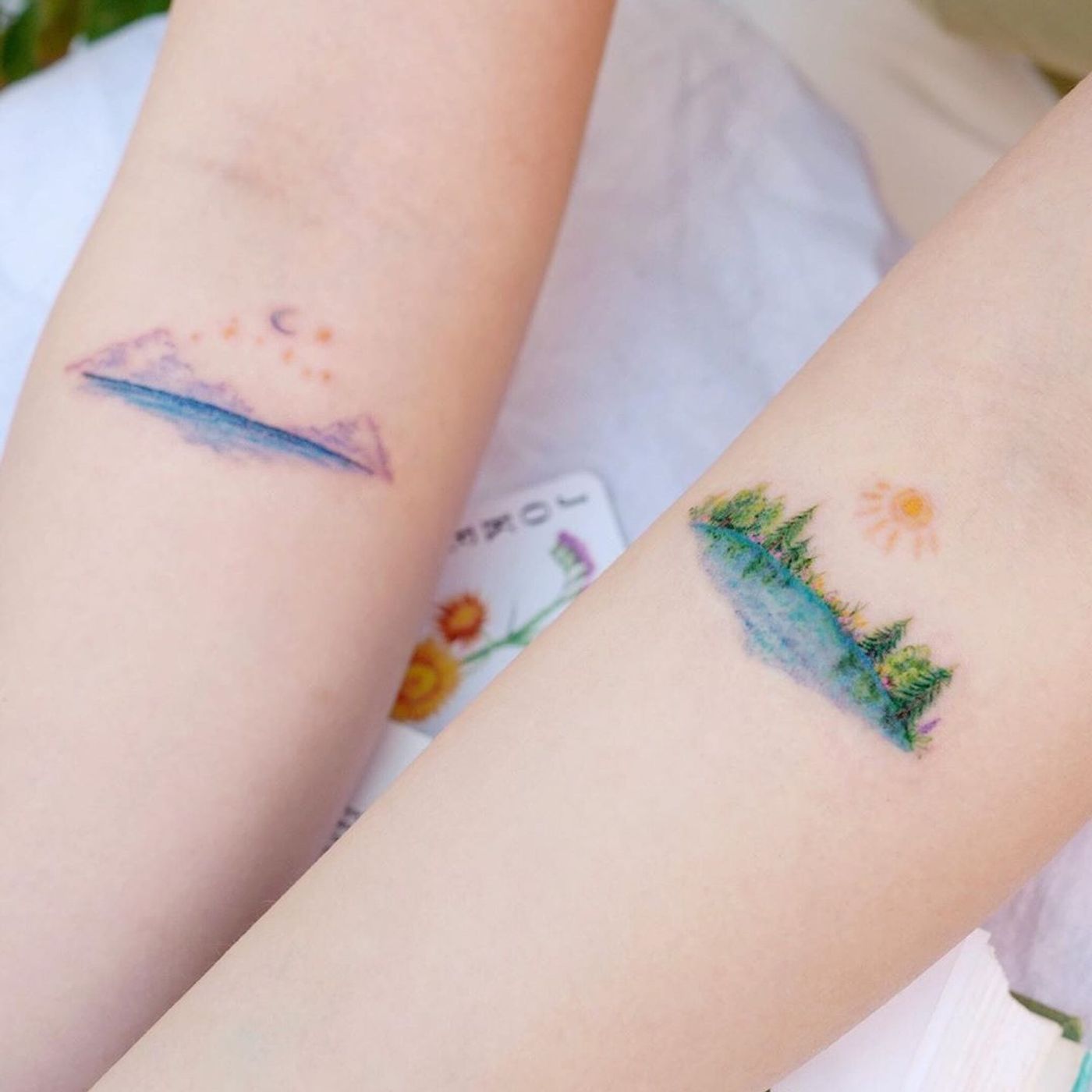 Illustrative watercolor tattoo by Ovenlee #Ovenlee #OvenleeTattoo #StudioBySol #watercolor #illustrative #colorpencil #sketch #cute #landscape #seascape #nature #forest #moon #sun #tree