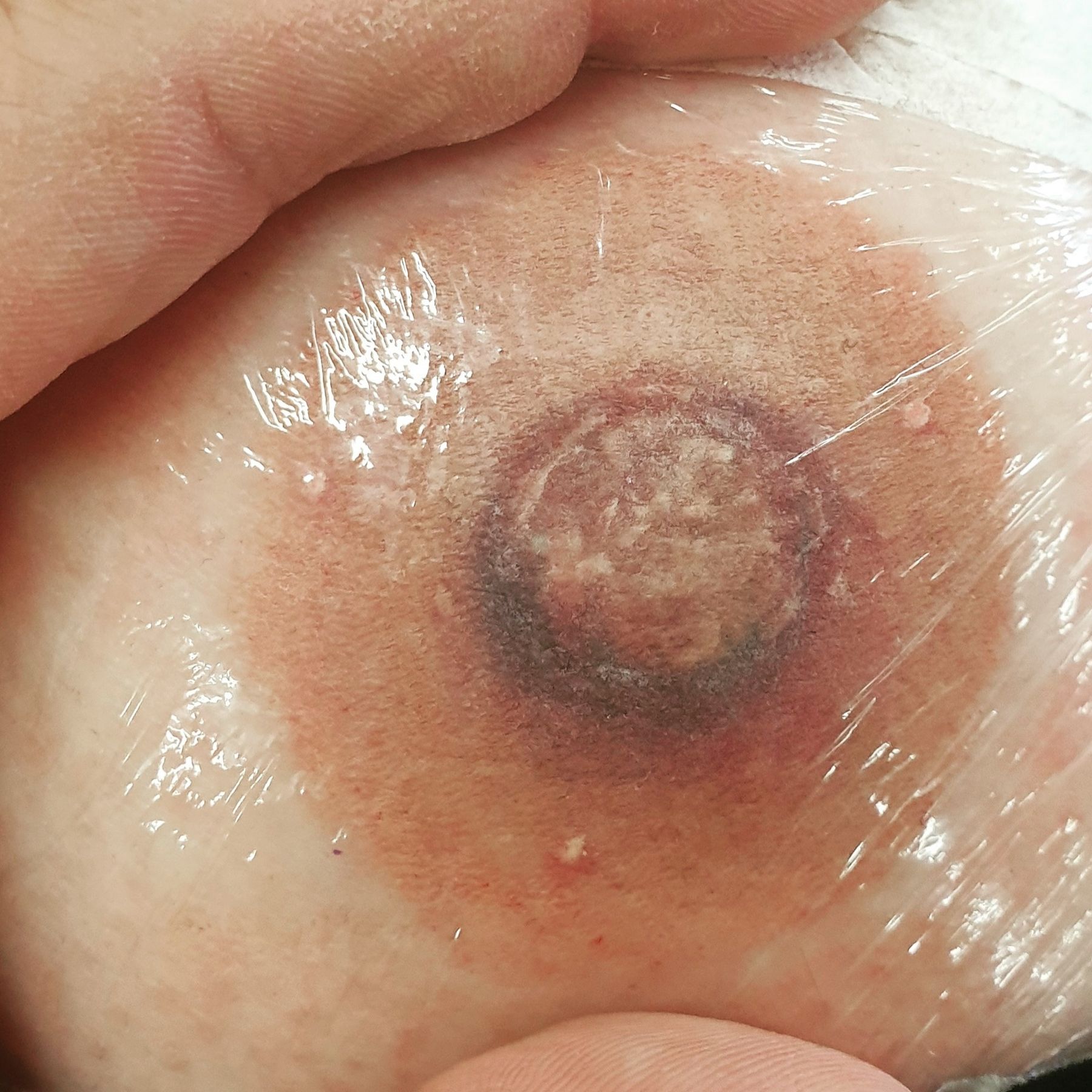 Areola tattoo on DIEP scar tissue. Post mastectomy, breast cancer survivor