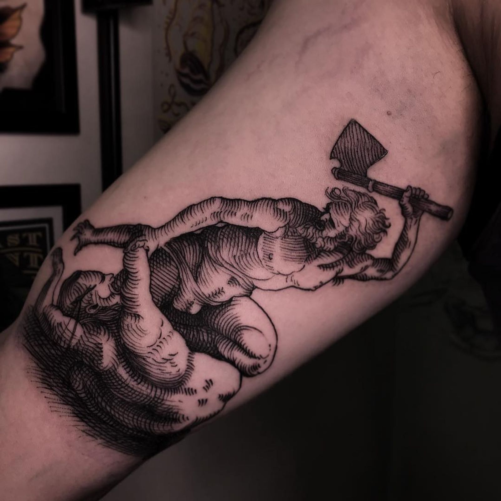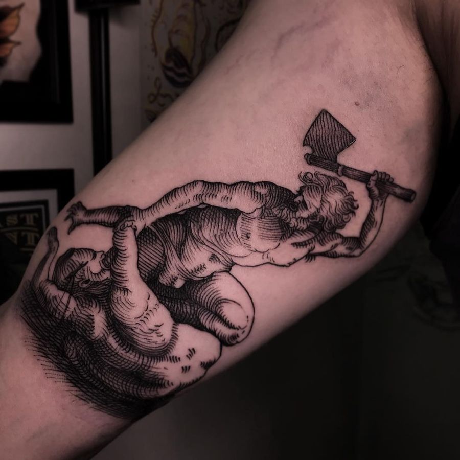 Cain and Abel tattoo by Alexander Gelmel #AlexanderGelmel #illustrative #linework #esoterictattoo #esoteric #cain #abel #cainandabel #darkart