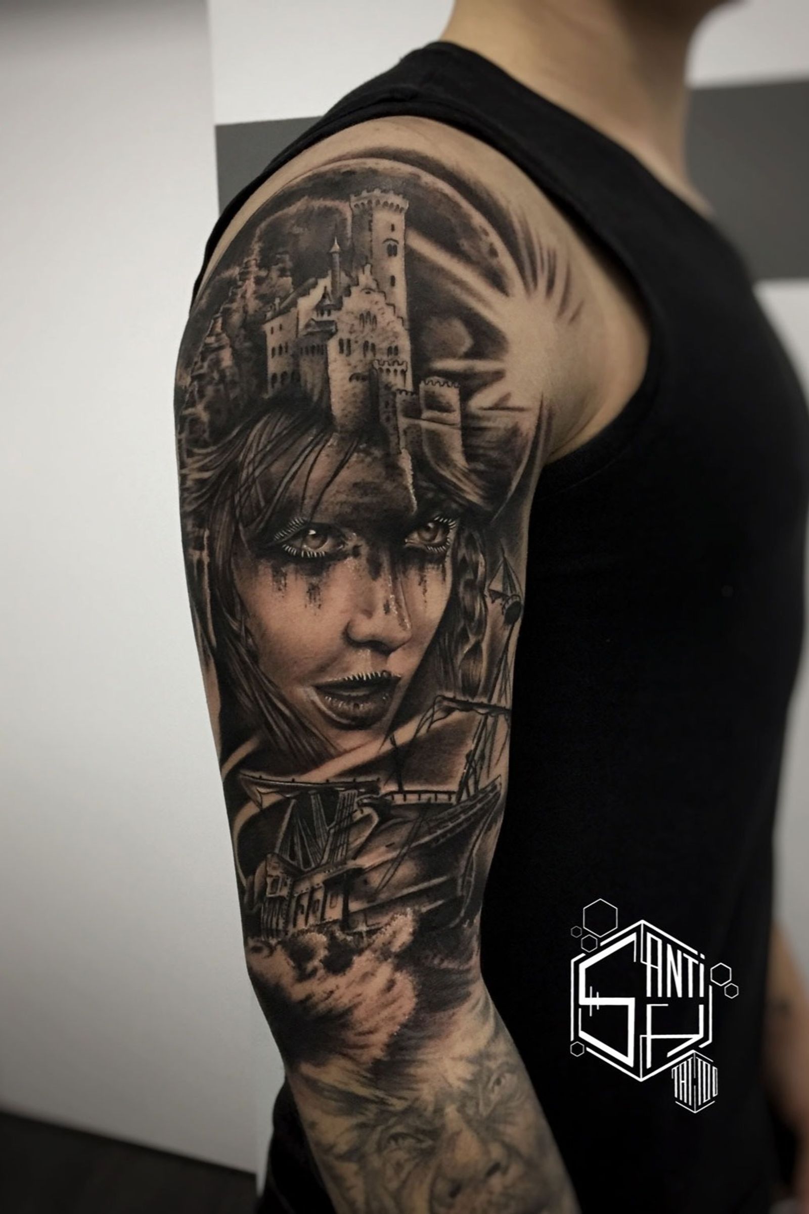 Tatuaje Surrealista en blanco y negro de mujer pirata con barco y castillo en el brazo. Tatuaje Realistas & Surrealismo de Santi H en Madrid