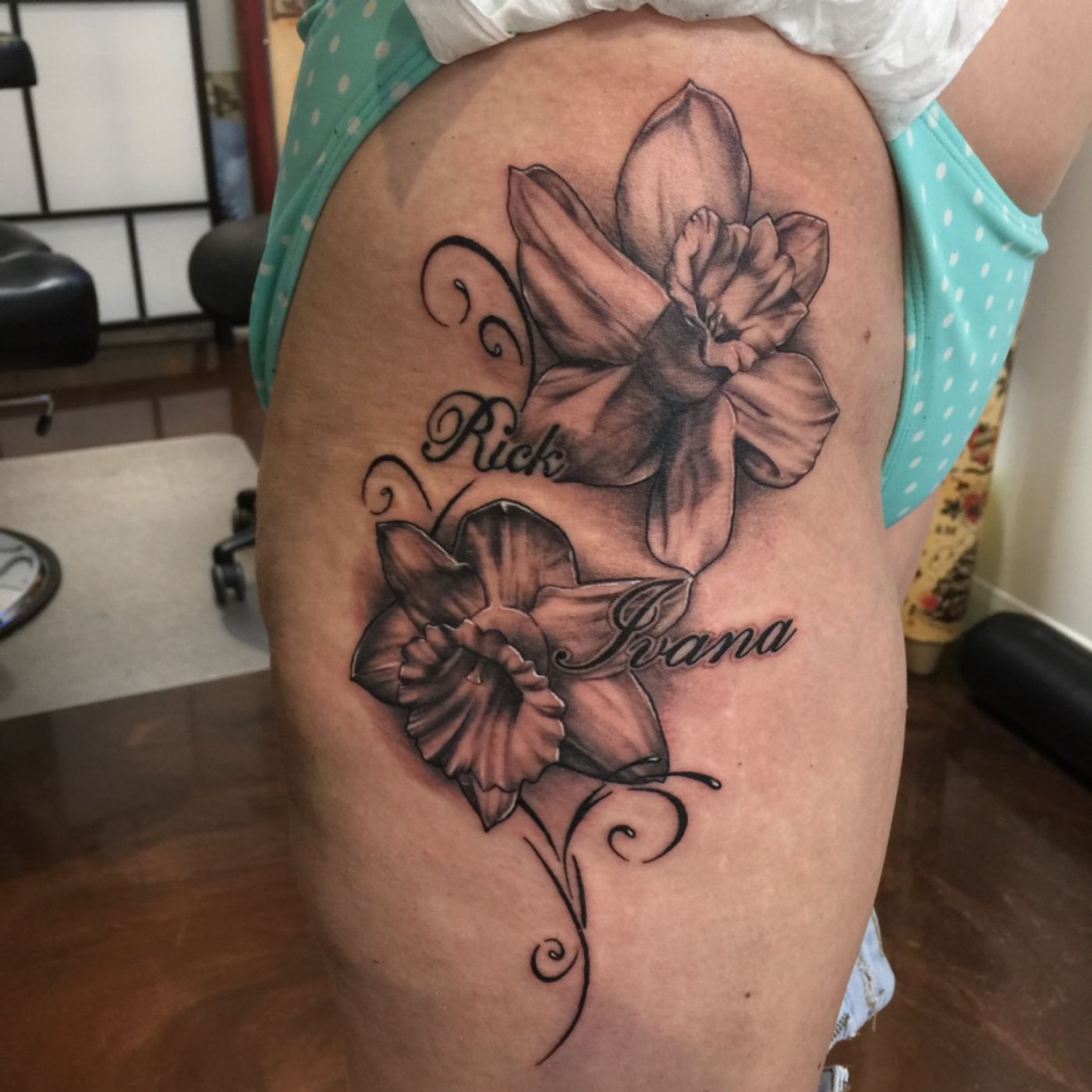Added some flowers to an excisting name tattoo (Rick) #nofilter #flowers #nametattoo #narcissus