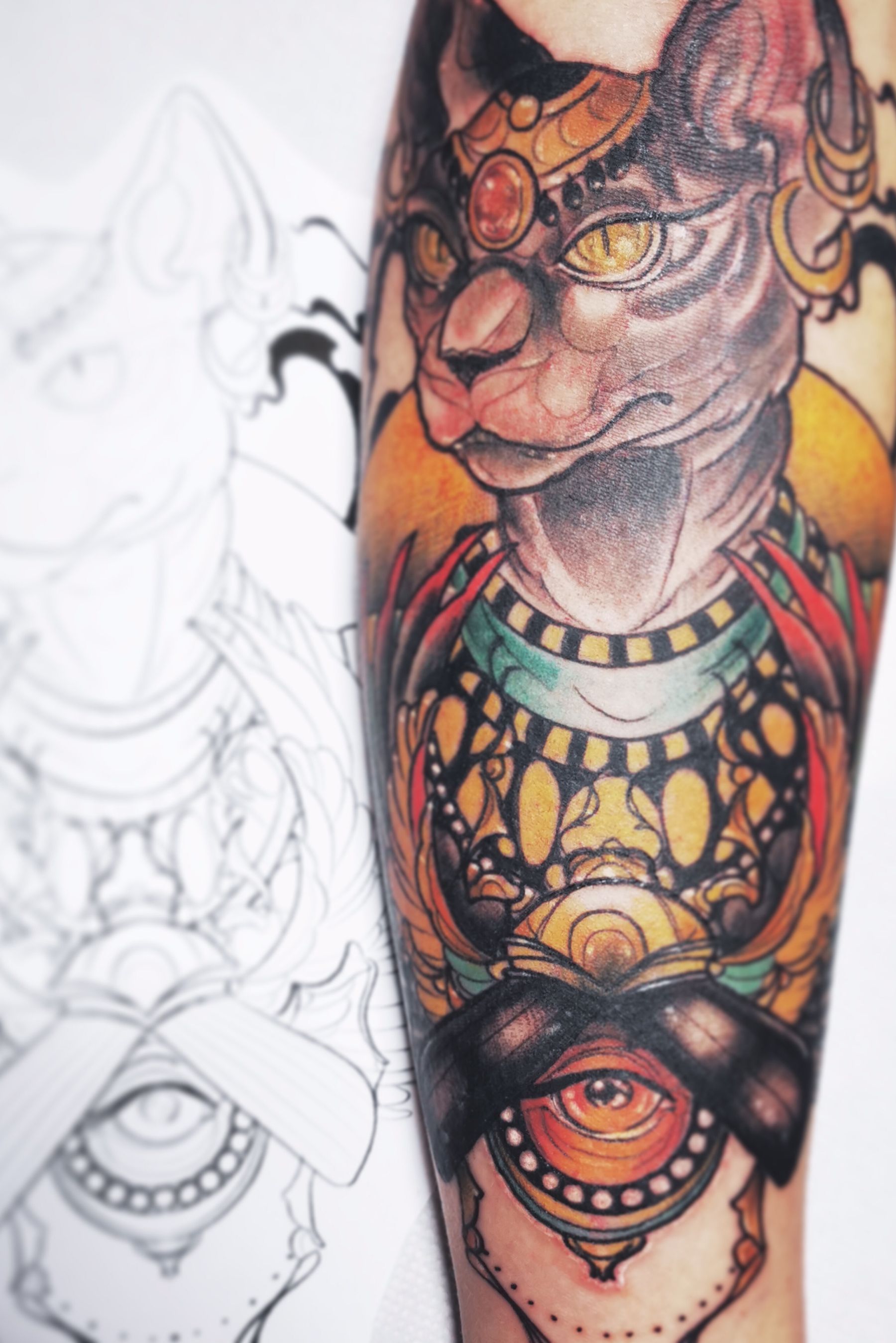 Bastet, me encanto este trabajo, deseando hacer más así. Citas al 640036355 #bastet #neotraditionaltattoo #thebesttattooartists #edwardortiztattoo #tattoo #neotraditionalists