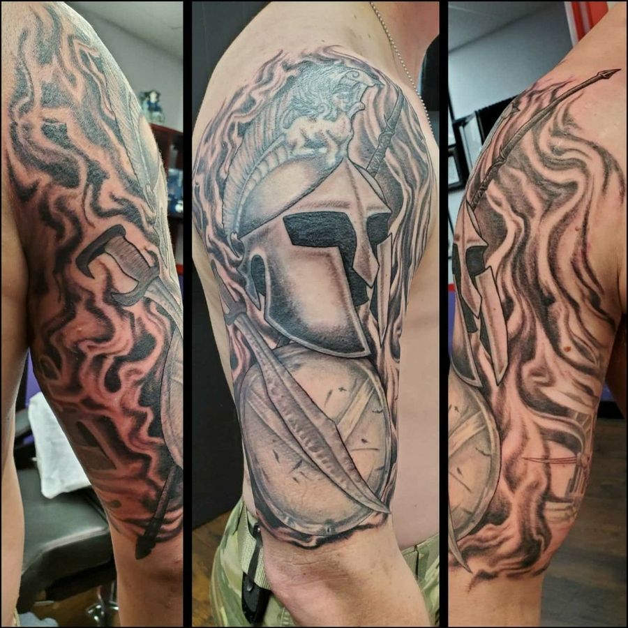 Retouched a 4 year old helmet I did, added shield, sword, filler, and inner bicep. (In another photo)
