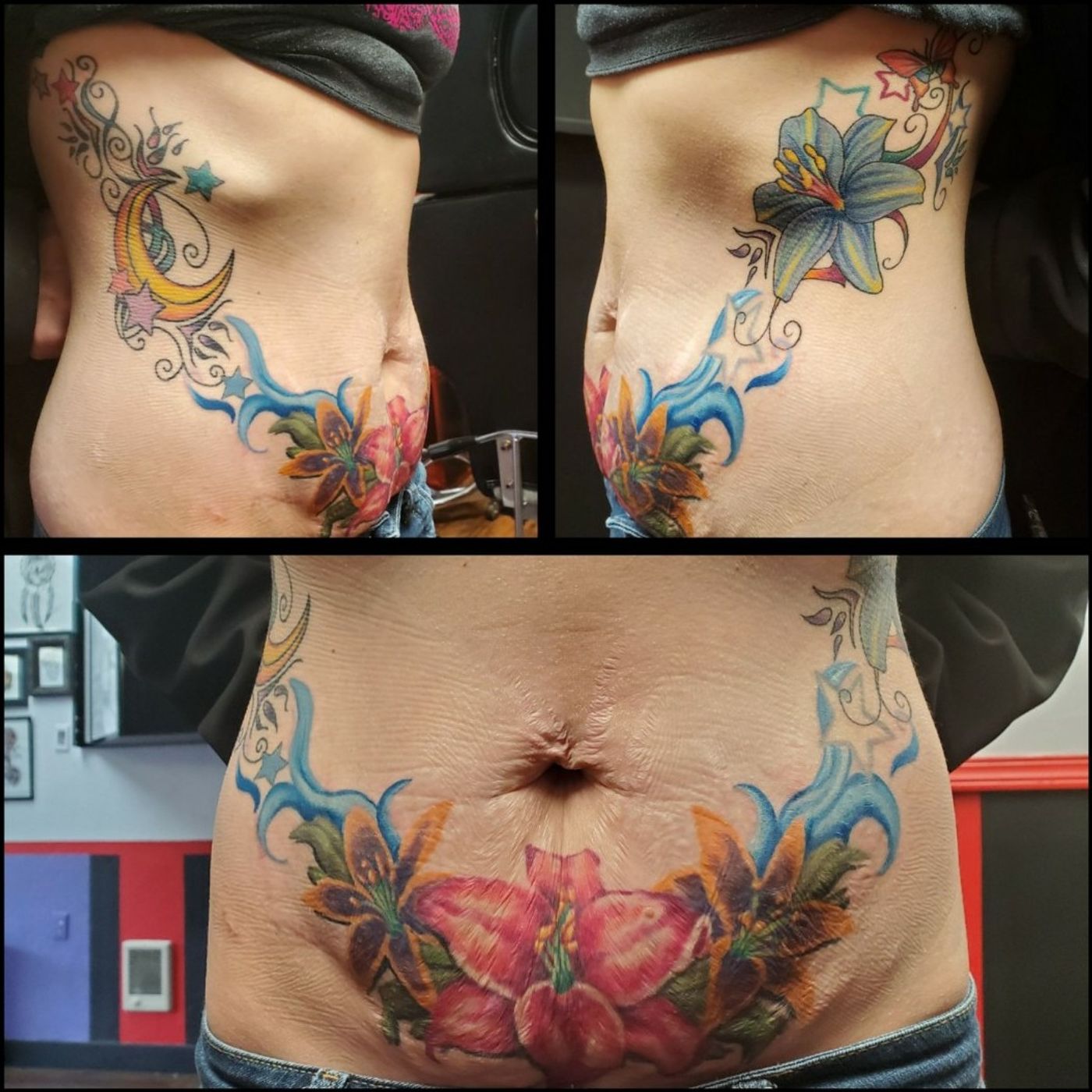 Finally connected the lower (scar tissue/stretch marks) coverup to both rib pieces ♡ blue is fresh, rest is healed.