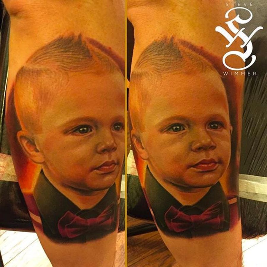 Beautiful colored portrait of a little kid done by Steve Wimmer. #SteveWimmer #portraittattoo #realistic #coloredportrait
