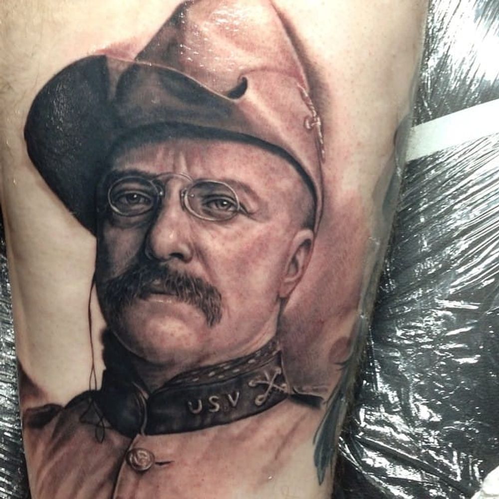An incredible tattoo of Teddy Roosevelt. Work by Steve Wimmer. #SteveWimmer #portraittattoo #realistic #teddyroosevelt #blackandgrey