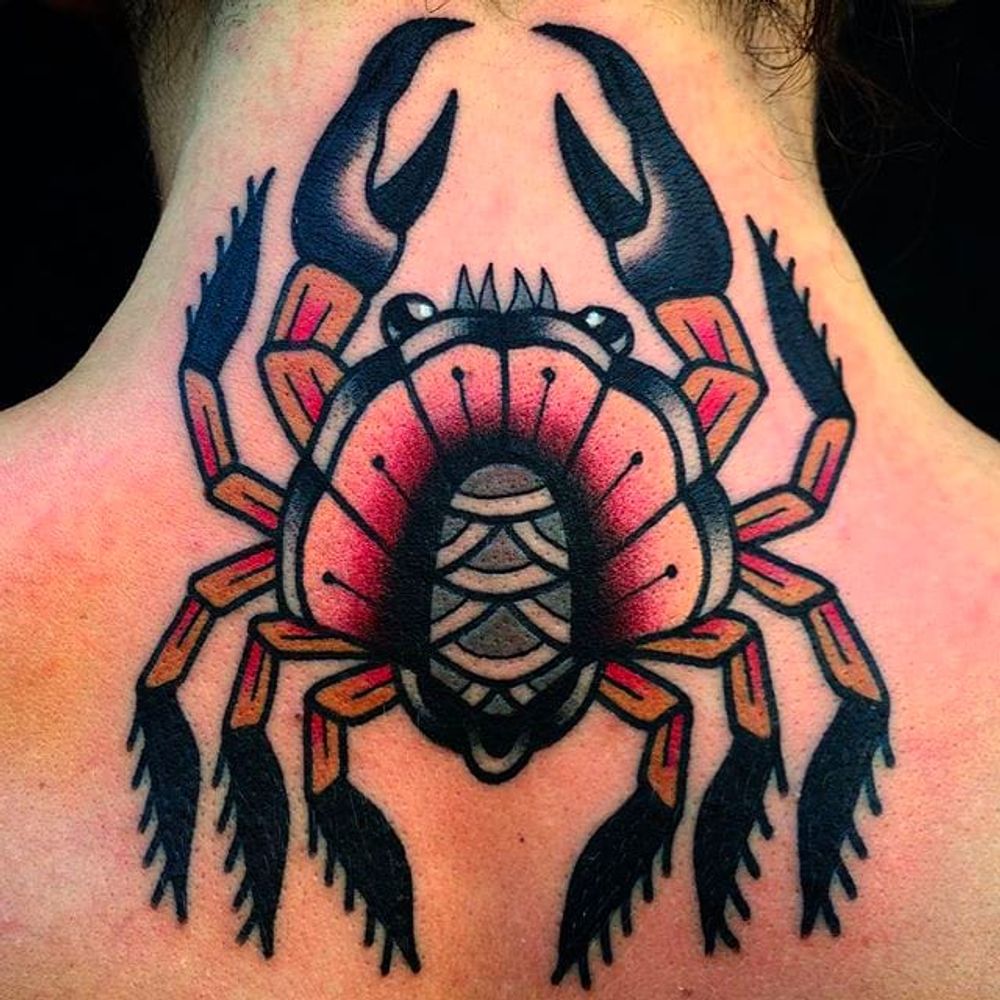 Beautfilly executed upper back tattoo, an awesome and clean looking crab. Excellent work by Giacomo Fiammenghi. #GiacomoFiammenghi #crab #traditionaltattoo #neotraditional #coloredtattoo