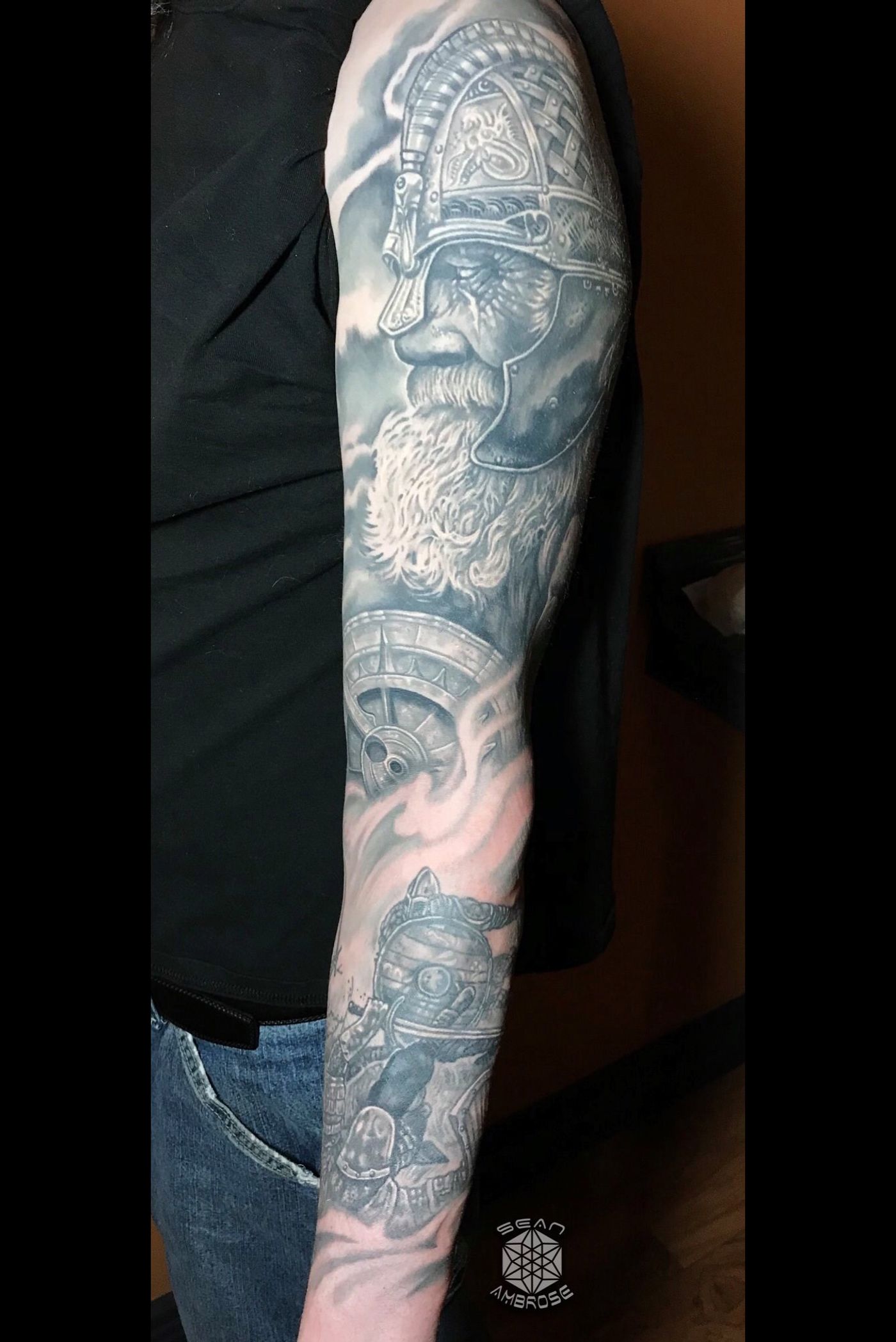 Odin, the Allfather, and Viking warrior sleeve, all finished! Black and gray/grey, I’d love to do a cool Valkyrie piece too-get at me if we’ve got the same goals!🔥