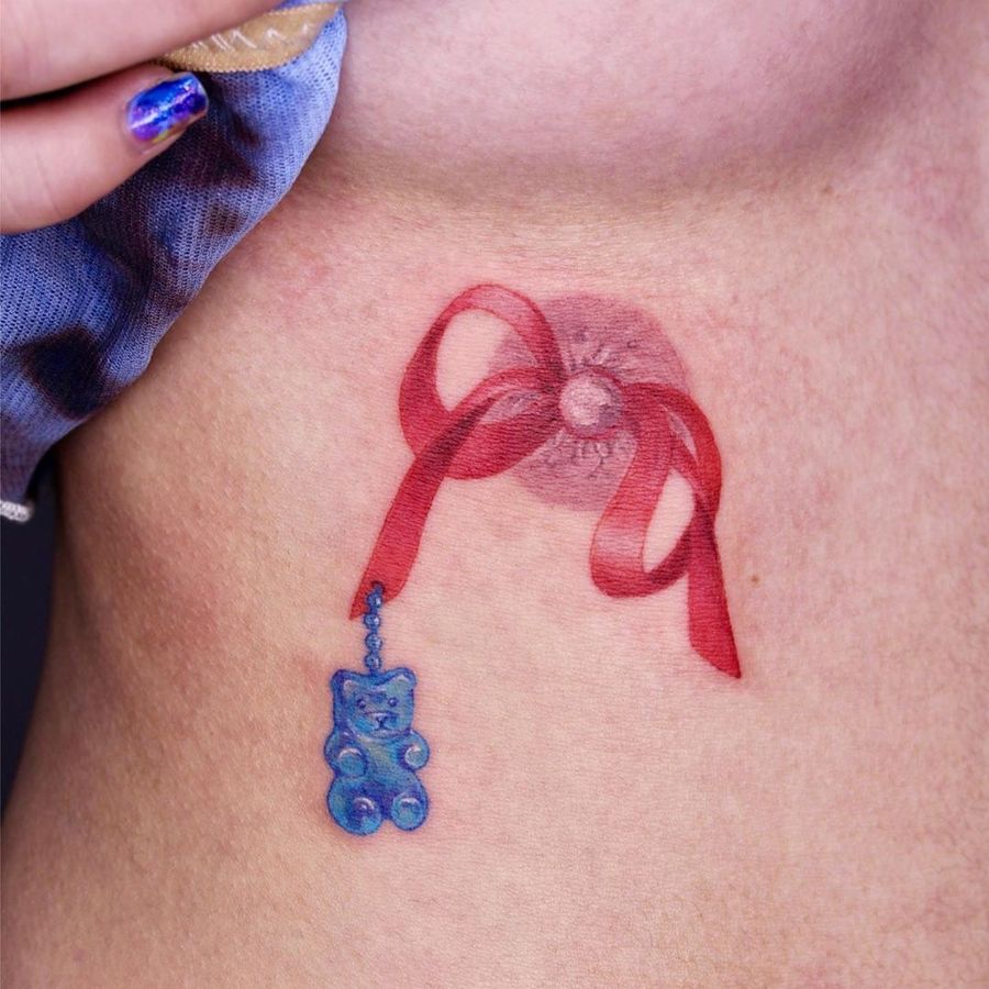 Tattoo by Anya Tsyna #AnyaTsyna #illustrative #realism #color #surreal #strange #unique #gems #diamond #ornamental #jewelry #fineart #nipple #gummybear #dessert #bow #ribbon