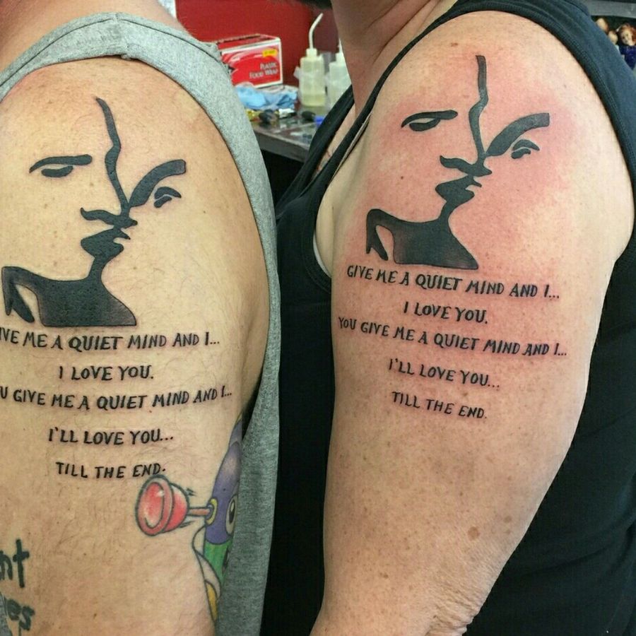 Original couples tattoo. Sillouette of my husband and I from a photo on our wedding day and a song lyric with special meaning to us.