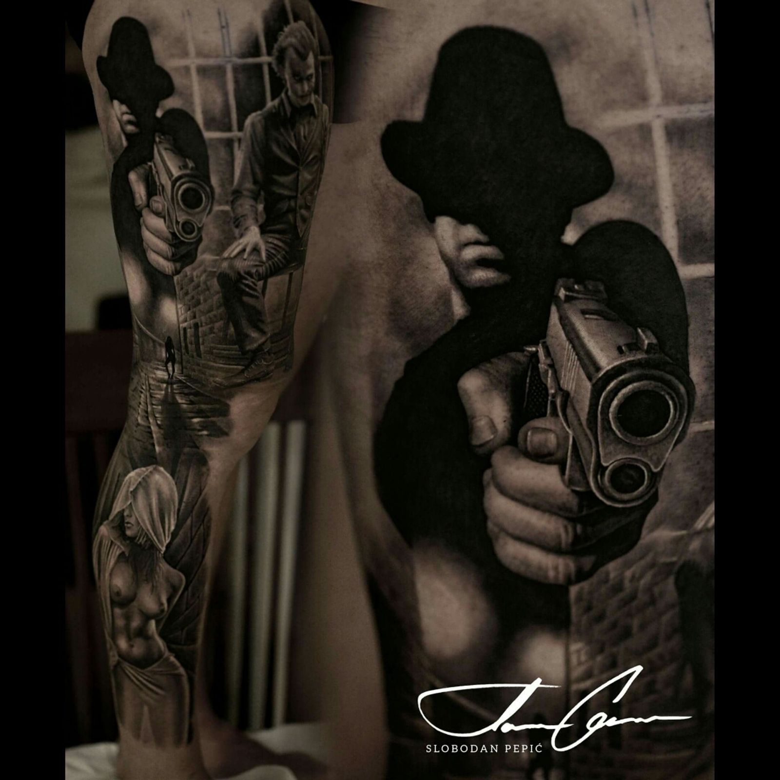 #blackandgrey #inkedmafia #perfection #sleevetattoo #mafia #jokertattoo #Joker #gun #detail #tattoo #besttattoos #dark #Lightsout #batman #batmantattoo #blackandgreytattoo #blackandgreysleeve #blackandgreyrealism