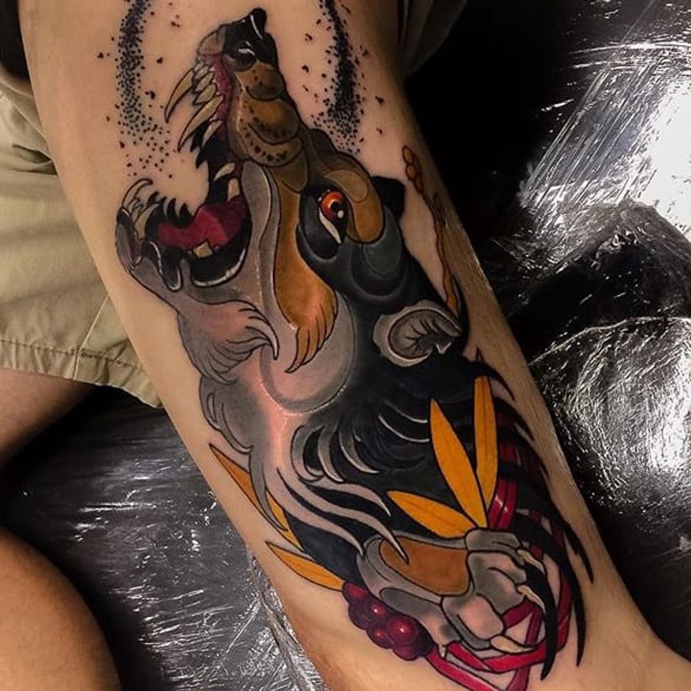Wolf Tattoo by Jarret Livingston #wolf #wolftattoo #neotraditionalwolf #neotraditional #neotraditionaltattoo #neotraditionaltattoos #neotraditionalartists #neotraditionalartist #moderntattoos #boldtattoos #bestneotraditional #JarrettLivingston
