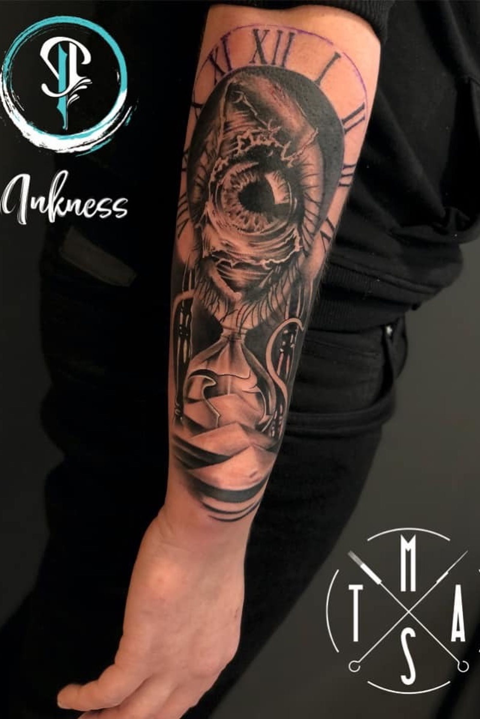 #3 #blackandgrey #clock #sandglass #eye #eyetattoo #watch #crying #sand #hourglass #tattoomen #realism