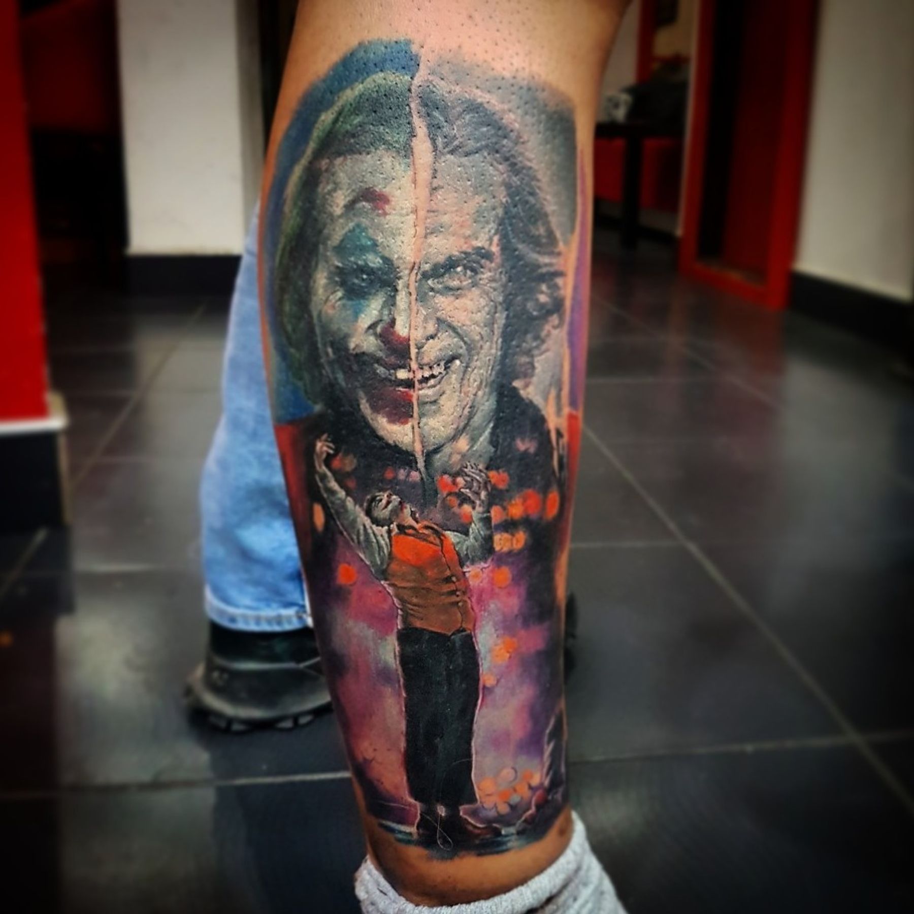 6h work #tattoing #tattoo #tattooink #tattooshop #tattooinsta #tattoodesign #realistictattoo #colortattoo #portraittattoo #jokertattoo #joker #legtattoo #ink #inked #inkedlife #inkedup #instaartist #instagram #work #art #instatattoolovers #instatattoo #inkmachines #tattooartist #guestartist #work #joaquinphoenixjoker #joaquinphoenix #tattoorealistic #skinart #skopjetattoo