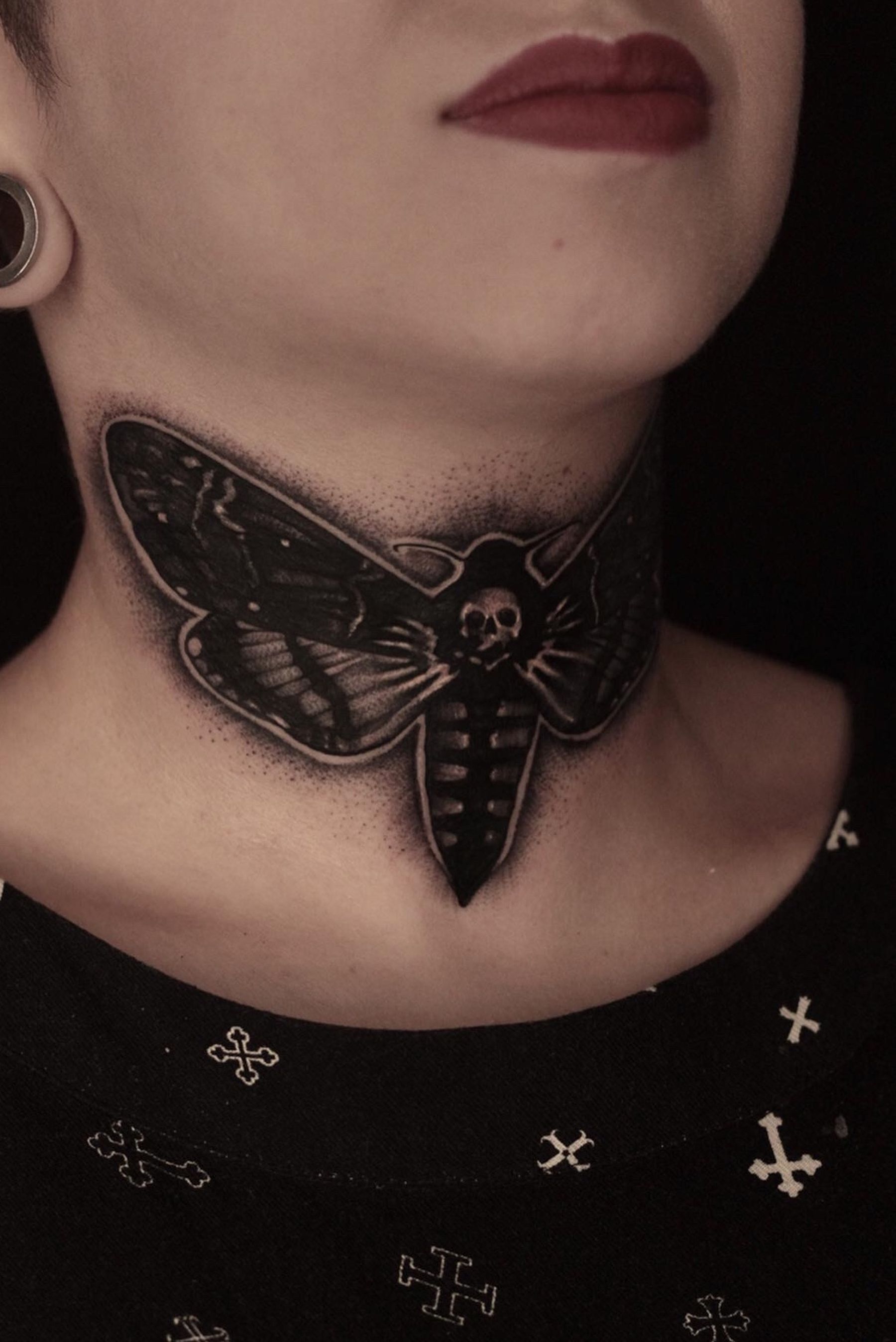 Acherontia atropos • neck (side) • — Bookings: lizminelli.art@gmail.com #darkart #blackwork #lizminellitattoo #deathmoth