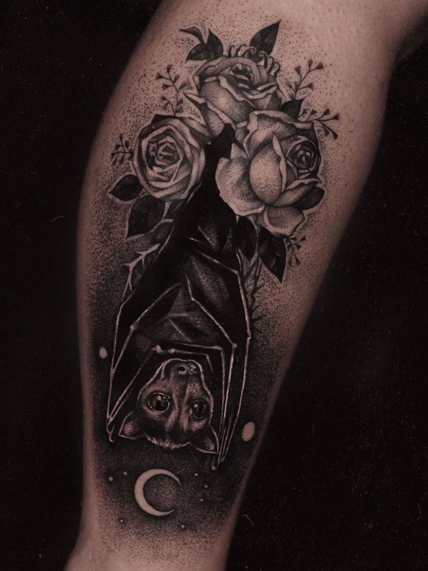 Flying fox bat. • — Bookings: lizminelli.art@gmail.com #darkart #blackwork #lizminellitattoo #fruitbat #battattoo