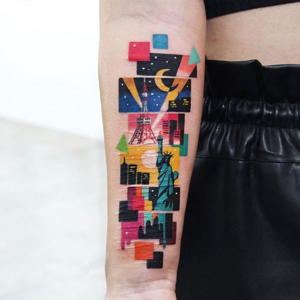 Eiffel Tower and Statue of Liberty tattoo by Polyc SJ #PolycSJ #seoul #korea #color #watercolor #popart #newschool #paris #newyork #eiffeltower #statueofliberty #scarcoverup #moon