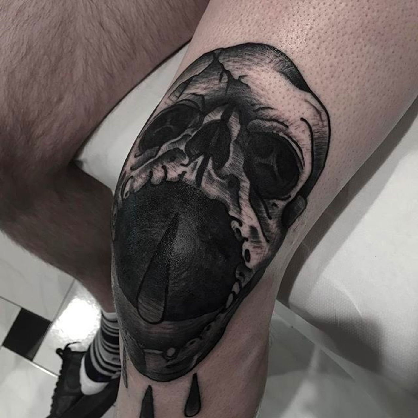 Brutal placement and intense looking skull tattoo on the knee cap! Awesome tattoo by Andrea Raudino. #AndreaRaudino #blacktattoo #blackwork #skull #kneecaptattoo #traditional