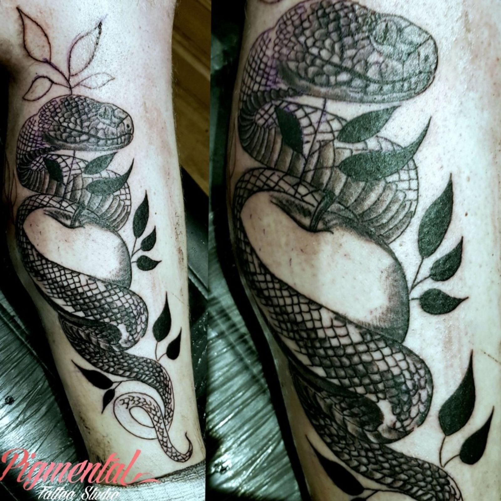 Snake and Apple Tattoo - In Progress Looking for to finishing this one 👍 #Snake #SnakeTattoo #AppleTattoo #SnakeAndApple #ApplesAndSnakes