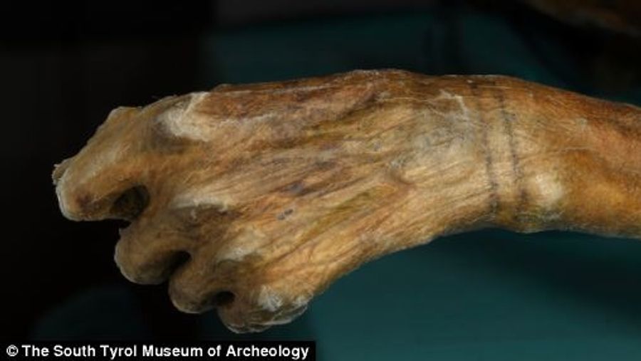 Horizontal Line tattoos on Otzi the Iceman’s wrist (Credit: The South Tyrol Museum of Archaeology) #ancienttattoos #geometrictattoos #blacklinetattoos #Otzitheiceman