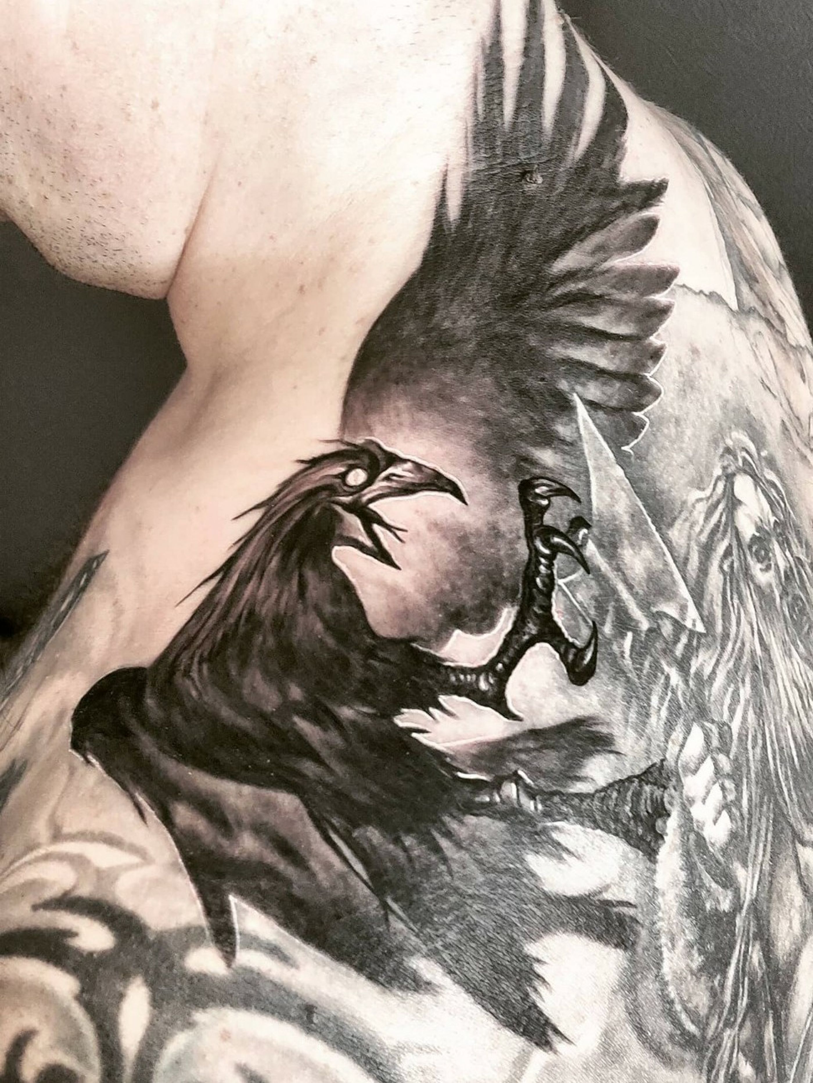 "The Crow" for faithful customer Oleg. To be continued. - Thx for the loyalty. ◼ #тату #ворон #trigram #tattoo #crow #raven #inkedsense