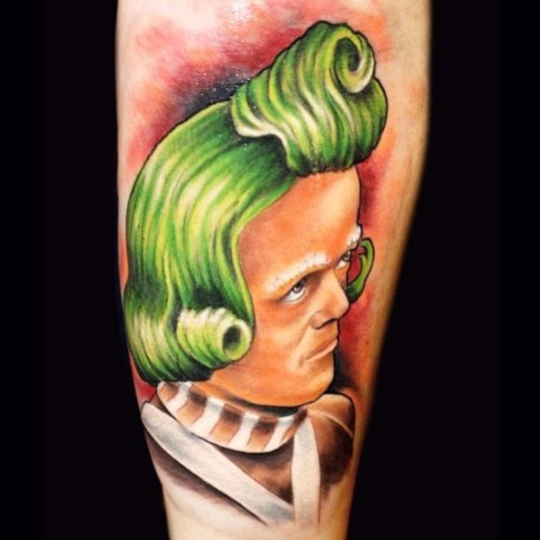 Loving this retro oompa loompa tribute. Tattoo by Geeksterinlegends #WillyWonka #RoaldDahl #chocolate #movie #retro #childhood #oompaloompa