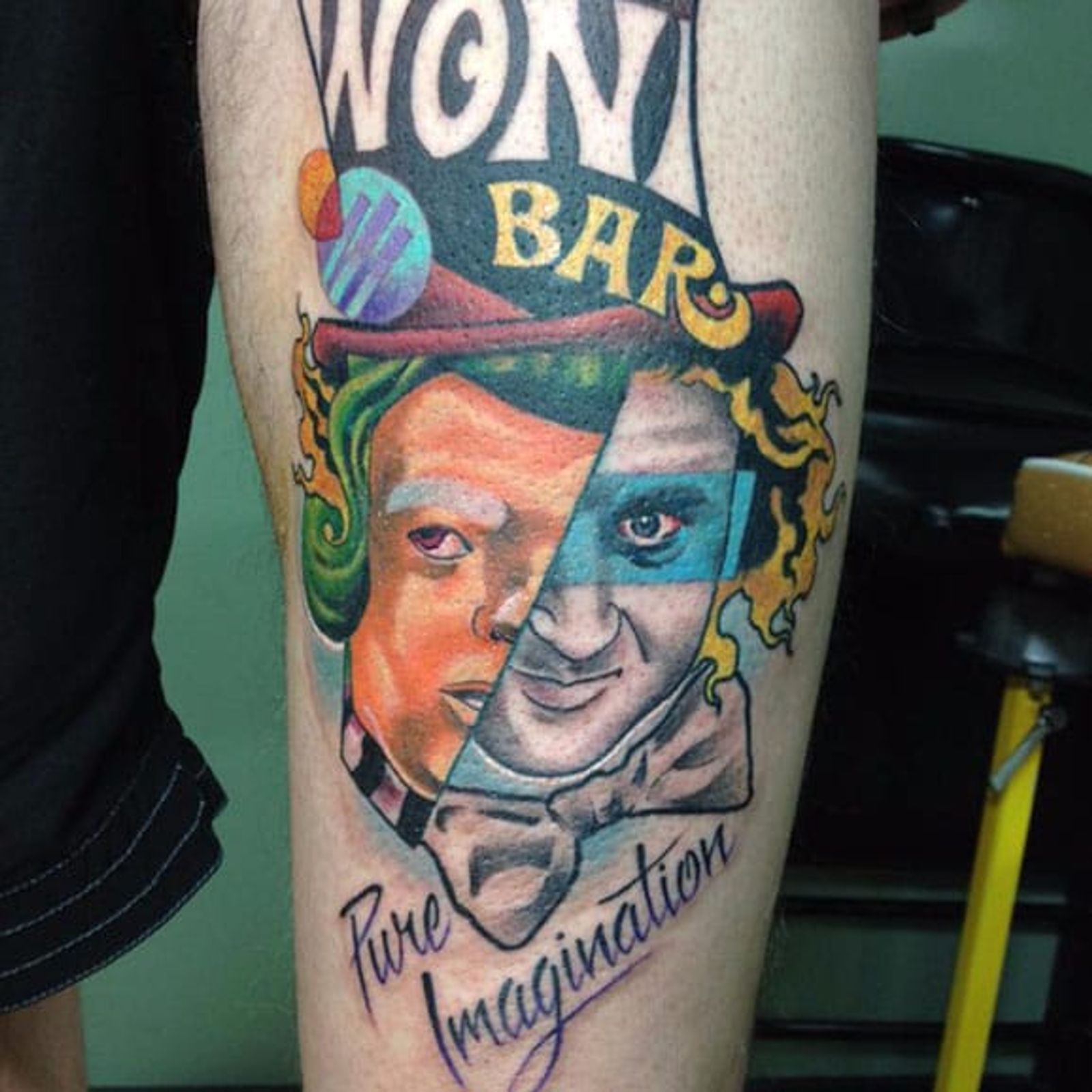 Cool abstract design of Wonka and an oompa loompa. Tattoo by Luke #WillyWonka #RoaldDahl #chocolate #movie #retro #childhood #oompaloompa #pureimagination