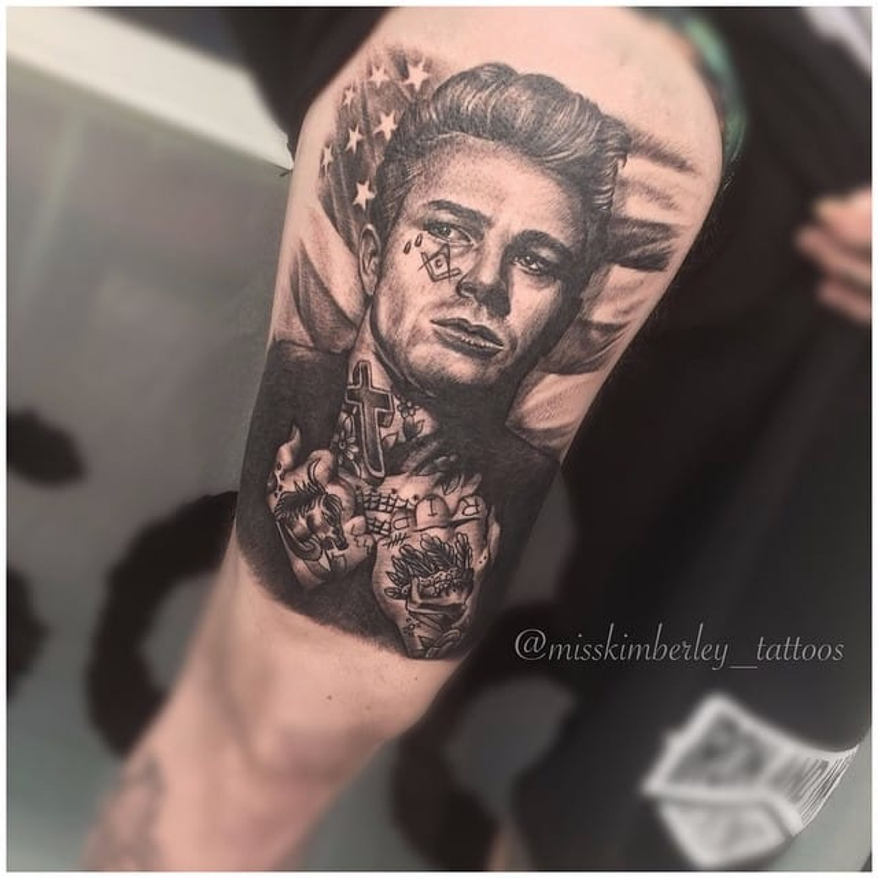 Tattooed James Dean tattoo by Miss Kimberley. #blackandgrey #realism #MissKimberley #portrait #JamesDean