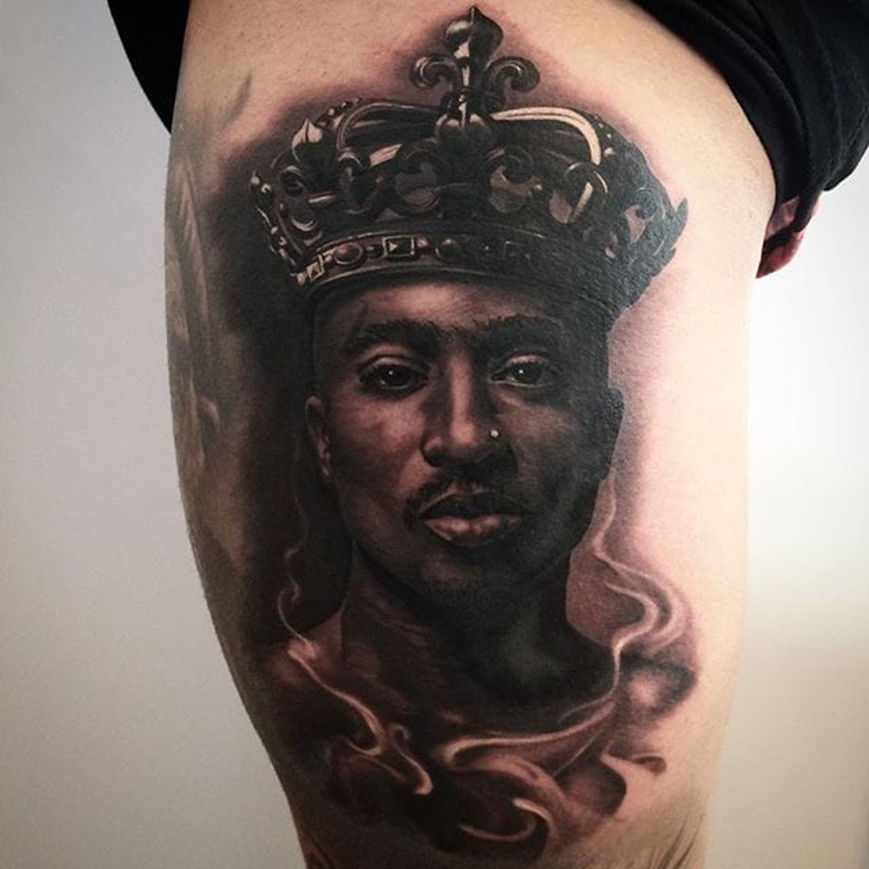 Black and grey Tupac portrait by Tater Tatts. #realism #TaterTatts #blackandgrey #Tupac