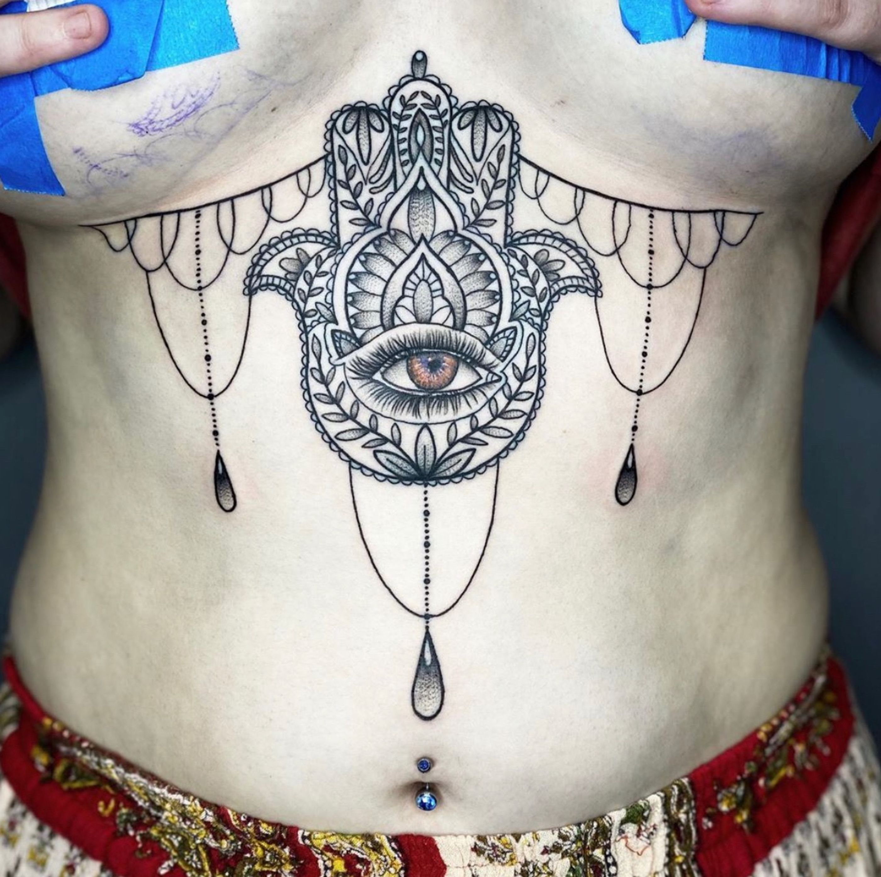 had so much fun for tattooing this beautifu sternum hamsa piece for @keely.lee and you are so brave girl! thanks for your trust 🧡 done at @thedarkessence with @metrixneedles