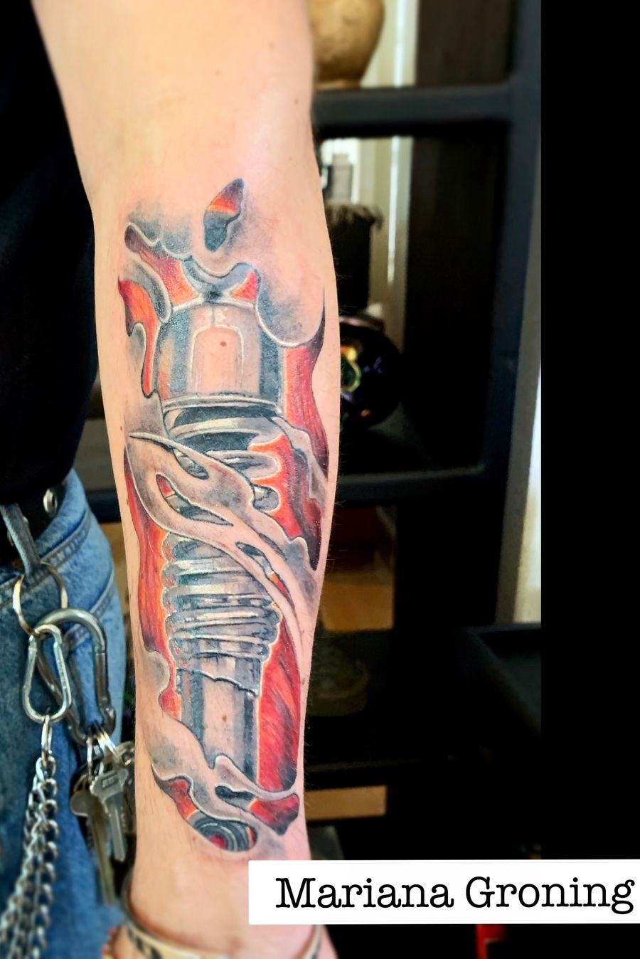Tatuaje biomecánico con detalles a color hecho por Mariana Groning. Envíanos mensaje y agenda tu cita #KarmaInkCollective #biomechanicaltattoo #estudiodetatuajescdmx #acuarela #tattoo #tattoowithheat #marianagroning #tatuajesencdmx #elmejorestudiodetatuajescdmx #agendatucita #tattooink