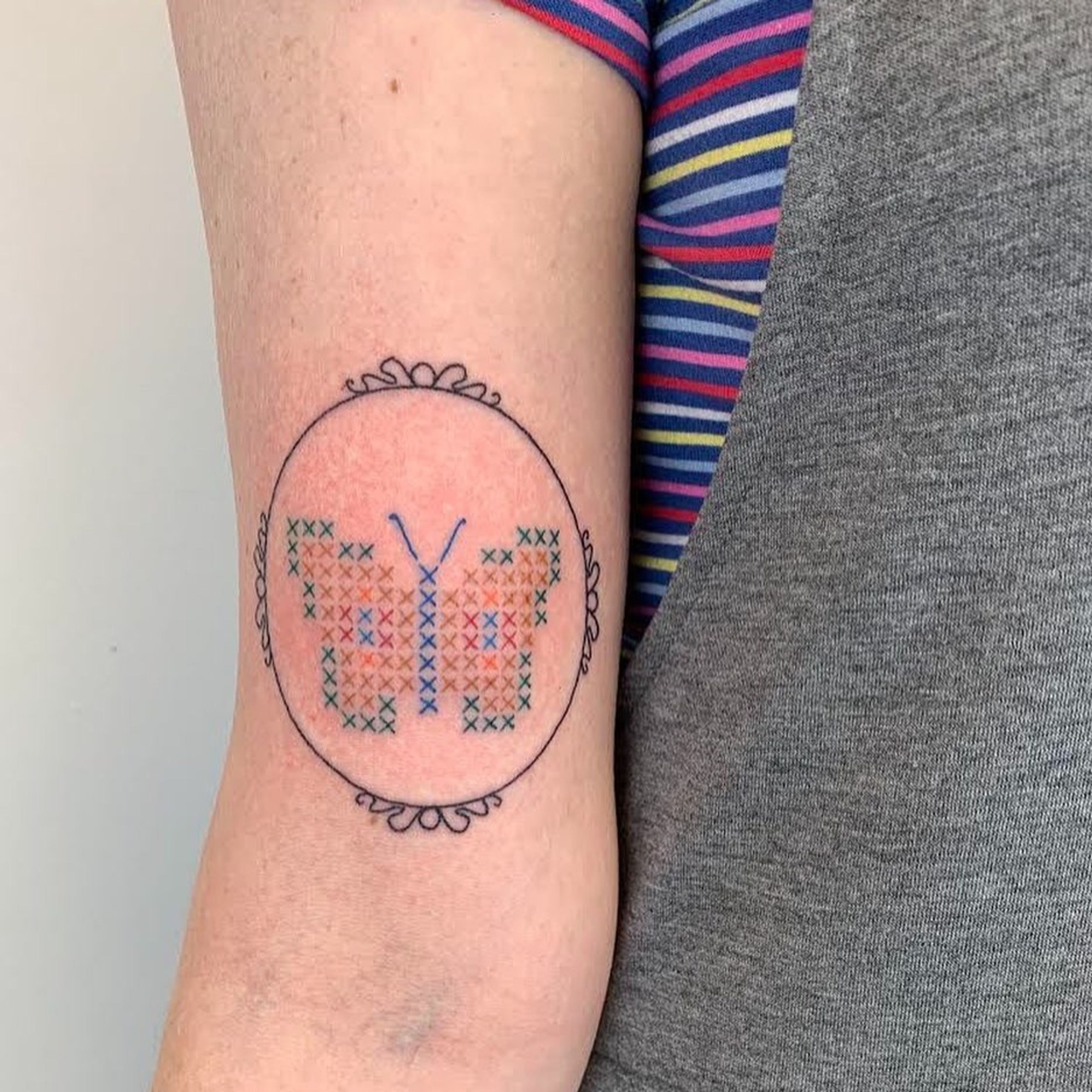 Cross stitch tattoo by stickandpeg #stickandpeg #crossstitchtattoo #embroiderytattoo #threadtattoo #sewingtattoo #art #craft #butterfly