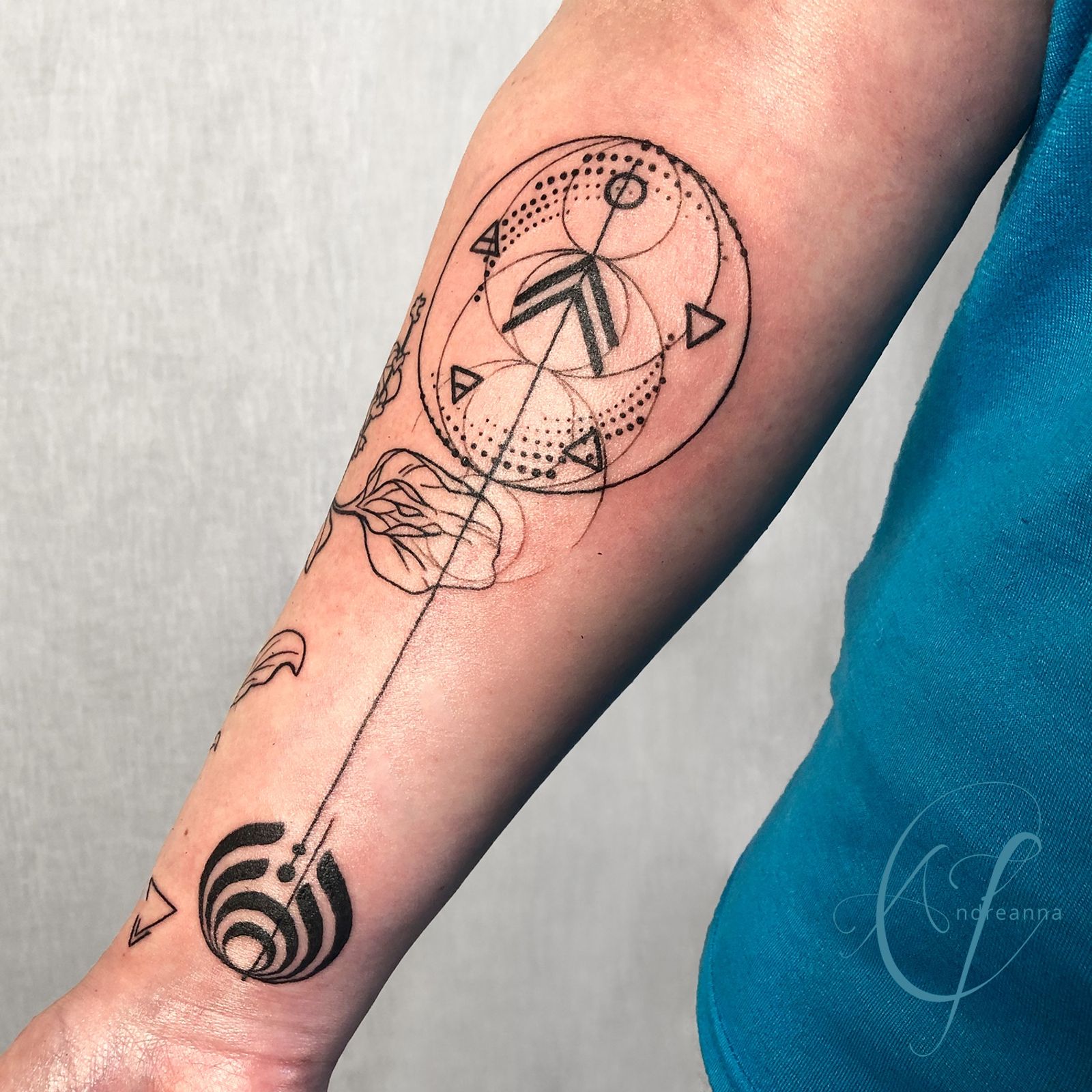 Geometric Alchemy Forearm Tattoo by Andreanna Iakovidis. #geometrictattoo #alchemytattoo #finelinetattoo #delicatetattoo #forearmtattoo #sacredgeometry