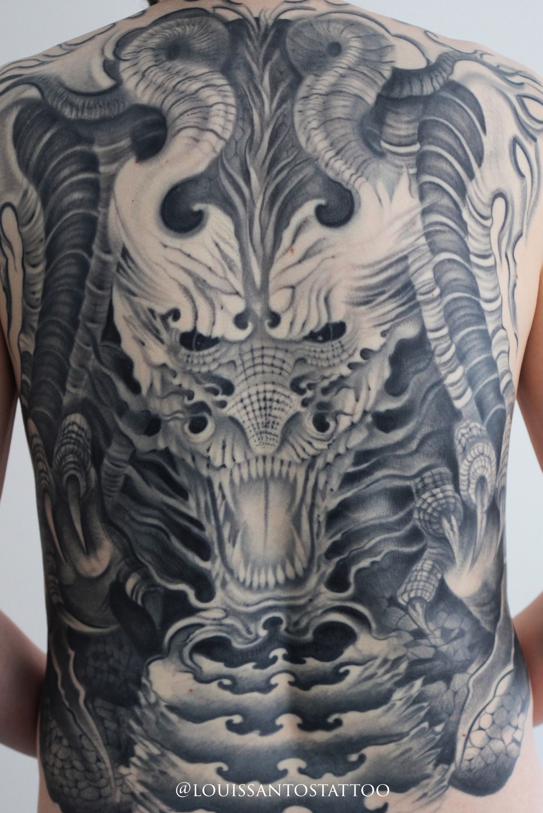 Black and grey, full back fantasy dragon #blackandgreytattoo #fullbacktattoo #fullback #dragon #fantasytattoos #tattoo #tattoos