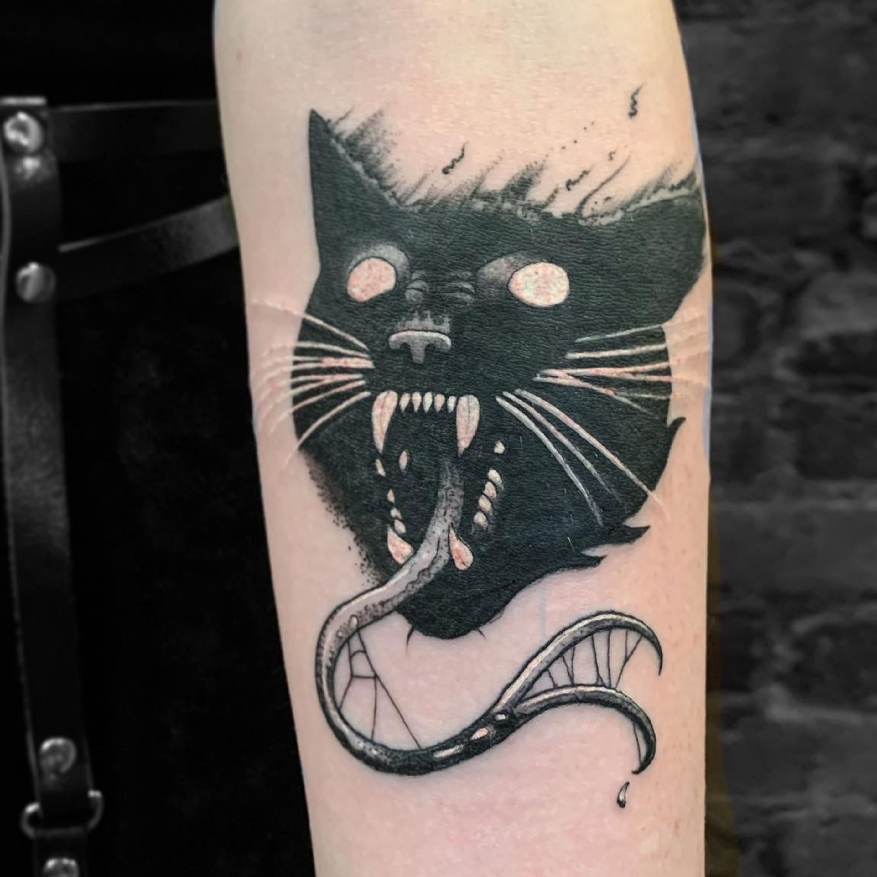 Get a fierce blackwork cat with its tongue out on your forearm by the talented Galen Bryce (Drip Skull).
