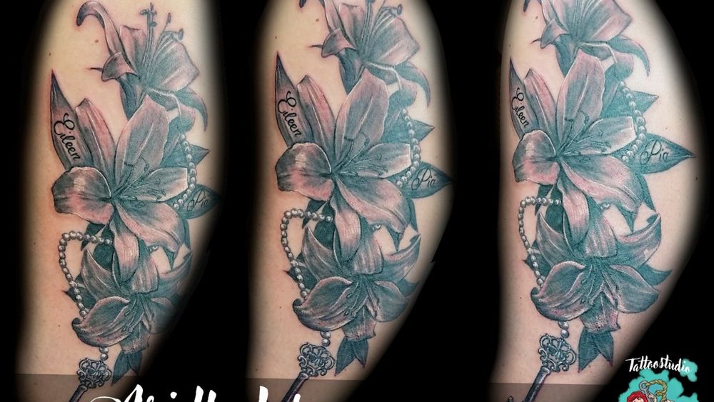 Lily Tattoo #tattoo #tattoos #freshink #freshlyinked #blackandgreytattoo #blackandgrey #realistic #realistictattoo #inkwell #thightattoo #girltattoo #lilly #lily