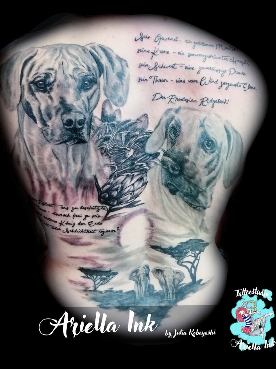 Finally finished the african - rhodesian ridgeback backpiece. Tribal coverup #tattoo #tattoos #freshink #freshlyinked #blackandgreytattoo #blackandgrey #realistic #realistictattoo #africa #africatattoo #elephant #elephanttattoo #ridgeback #ridgebacktattoo #rhodesianridgeback #backpiece #workinprogress #wip #dog #dogtattoo #protea #proteaflower #proteatattoo