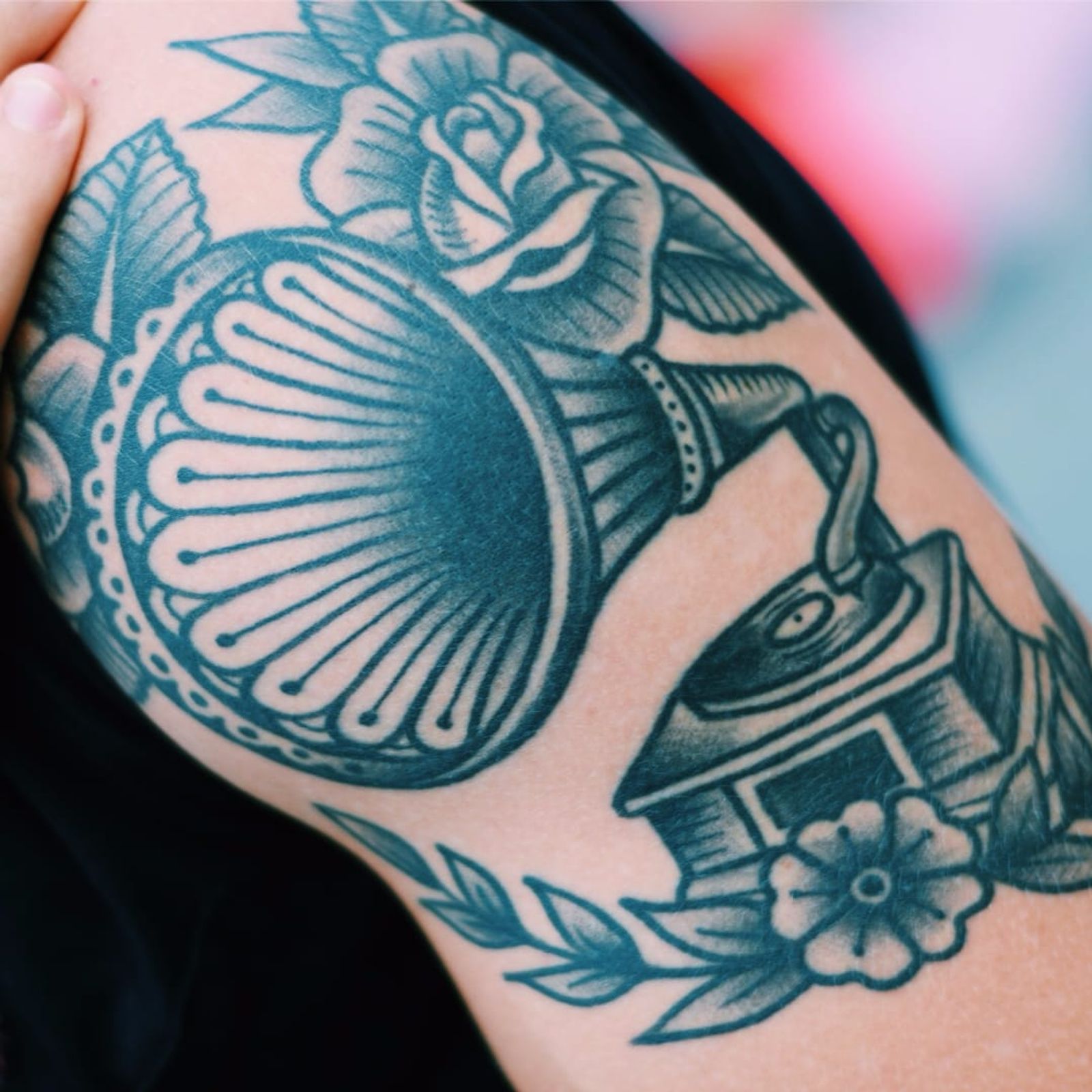 Traditional gramophone tattoo #traditional #gramophone #music #traditionalflower #rose #blackwork #streetstyle #TattooStreetStyle