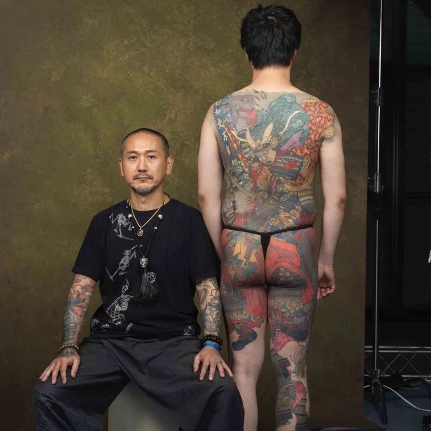 Shige Yellowblaze sitting with one of his client's tattoos on display #ShigeYellowblaze #irezumi #japanesetattoo