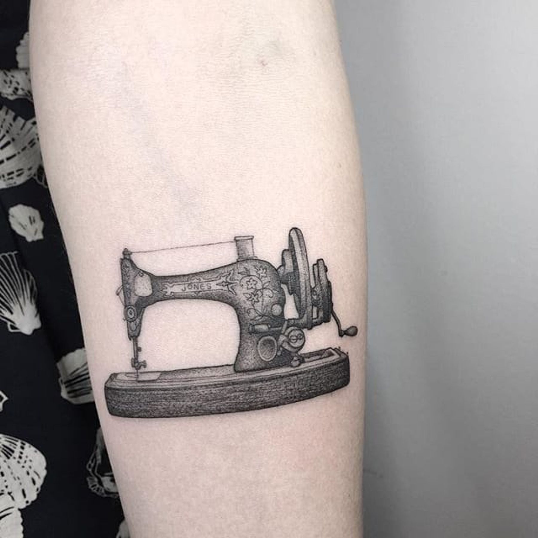 Sewing Machine Tattoo by Nathan Kostechko #sewingmachine #sewingmachingtattoo #blackandgrey #blackandgreytattoo #blackandgreytattoos #fineline #finelinetattoo #blackwork #detailed #NathanKostechko