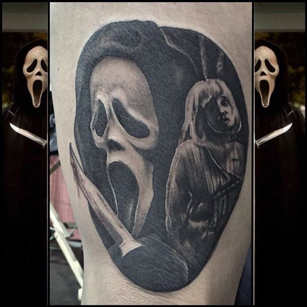 Ghost face and Drew Barrymore Scream inspired tattoo by Shane Murphy. #blackandgrey #realism #horror #Scream #GhostFace #DrewBarrymore #ShaneMurphy