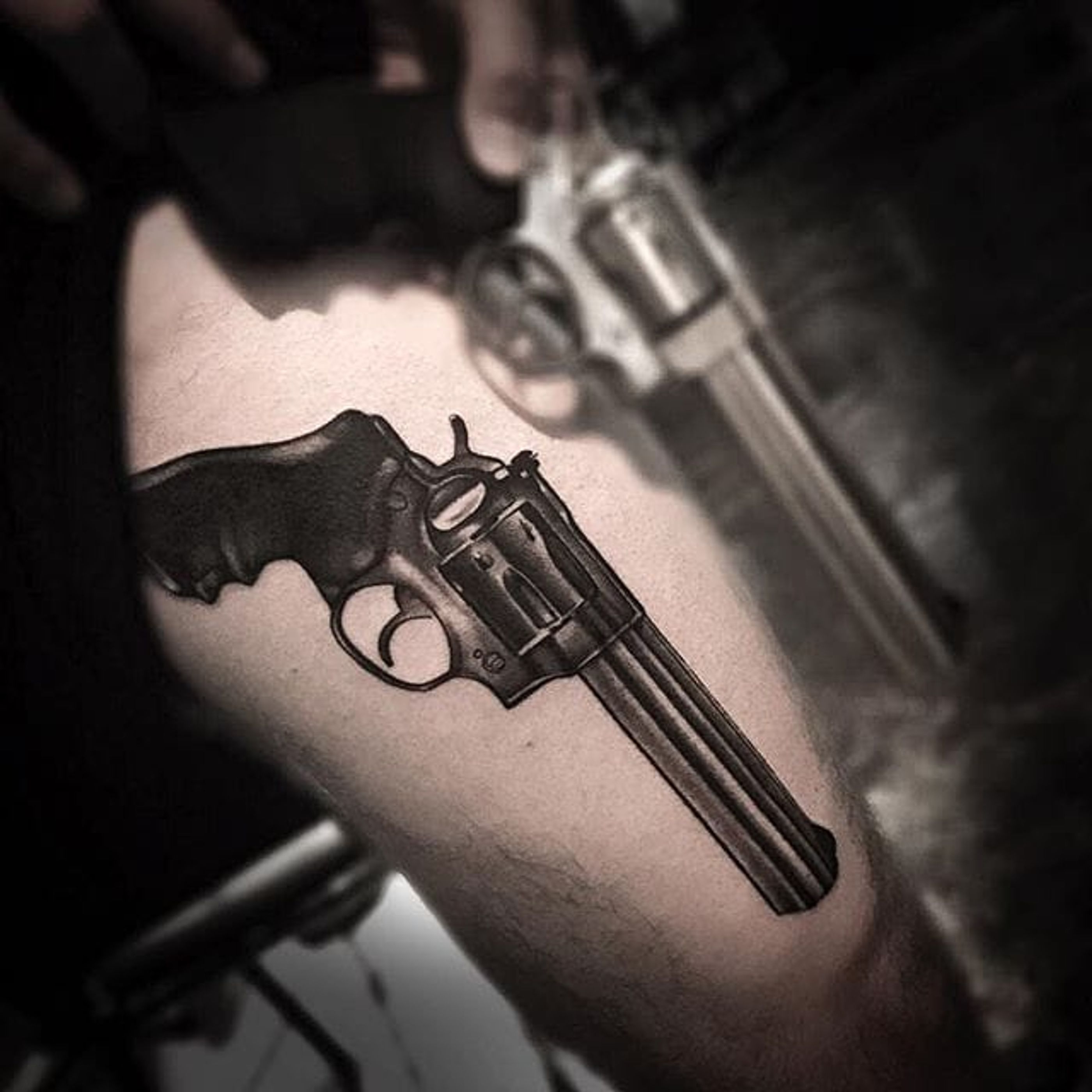 Realistic pistol tattoo by Jay Quarles. #blackandgrey #realism #gun #weapon #pistol #JayQuarles