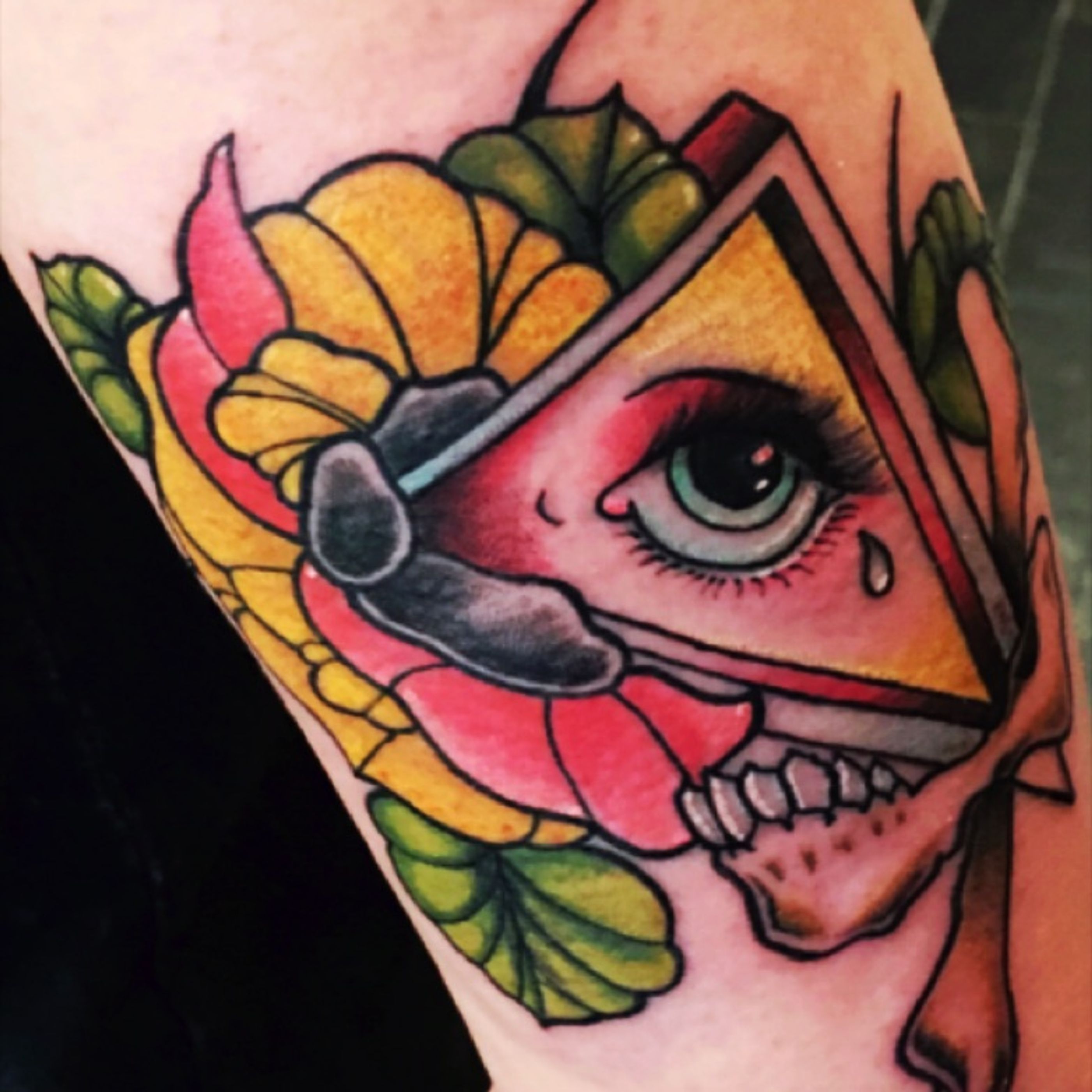 Tattoo i got done yesterday up in jersey city, nj done by adam at body and soul tattoo #neotraditional #allseeingeye #rose #jawbone #crybaby #colortattoo