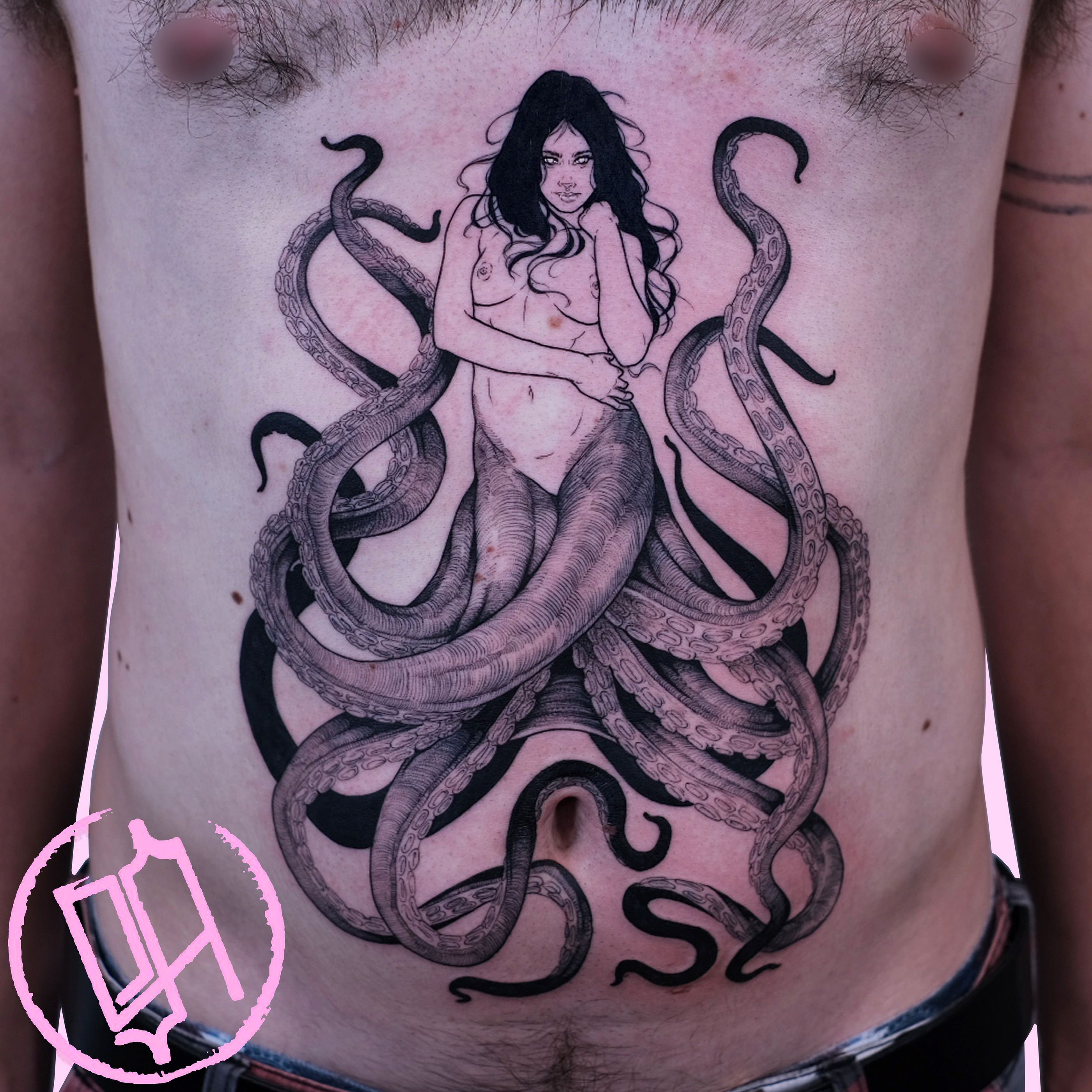 Octopus mermaid on stomach done at @thechurchworkshop with love 🖤. Done in one 7 hours session on a strong guy!