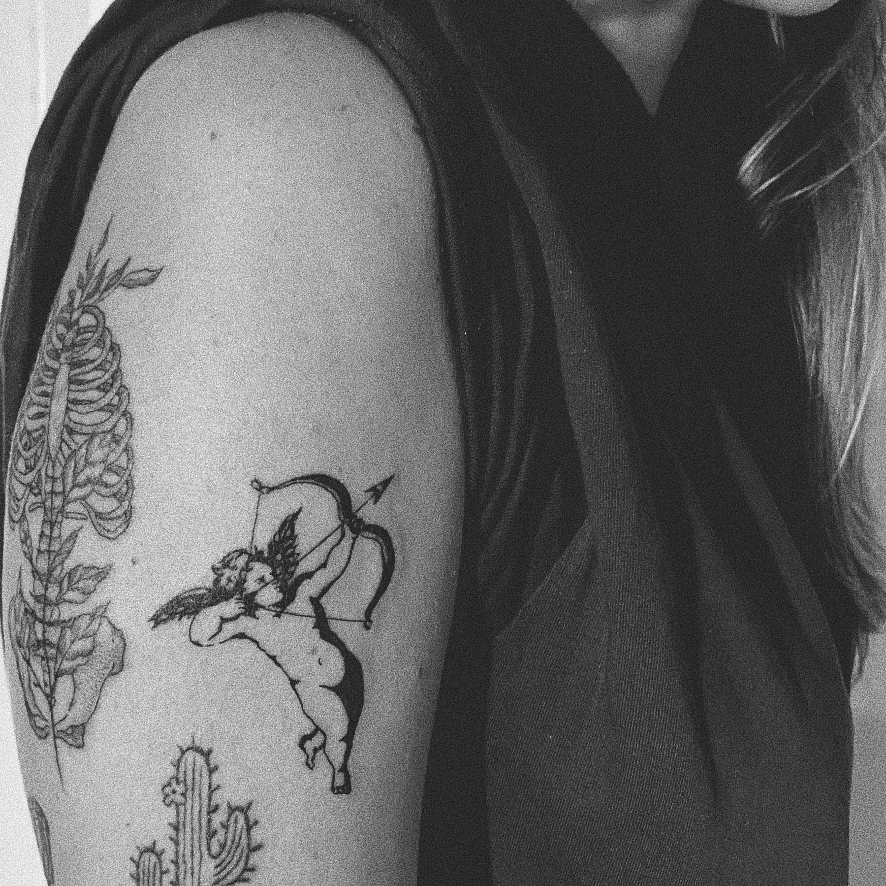 #tattoo #angeltattoo #angelwithbow #bow #linework #lineworktattoo #black #dynamicink #minimal #minimalism #stattoo #smalltattoo #girlswithtattoo
