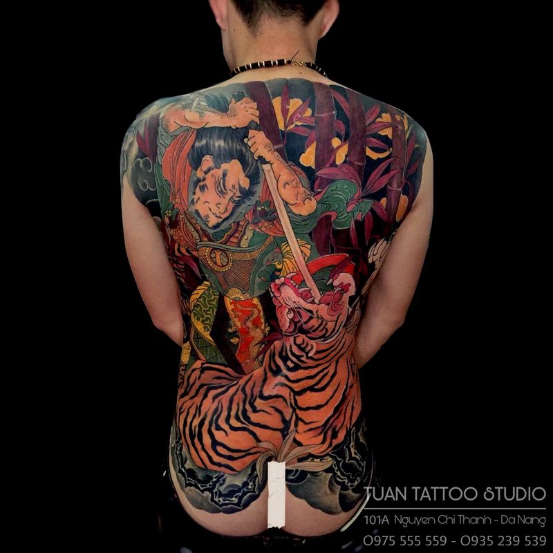 Samurai with Tiger wars - Japanese Tattoo full back by Artist at TUAN TATTOO STUDIO - Xăm hình nghệ thuật Đà Nẵng