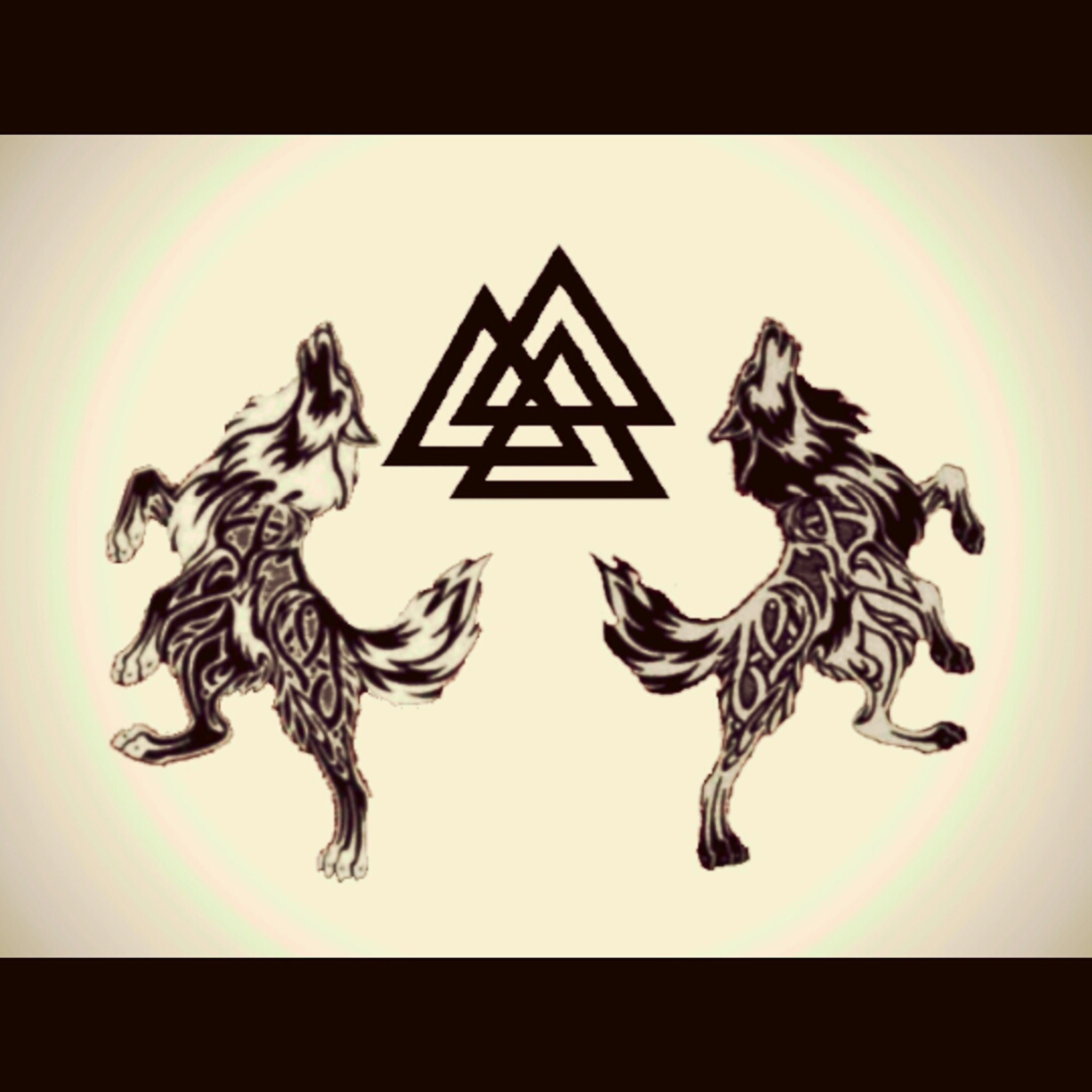 The wolves are Freki and Geri, two servants of Odin whose names mean "the ravenous" or "the greedy ones" and the series of triangles called the Valknut which is the Norse symbol for fallen warriors