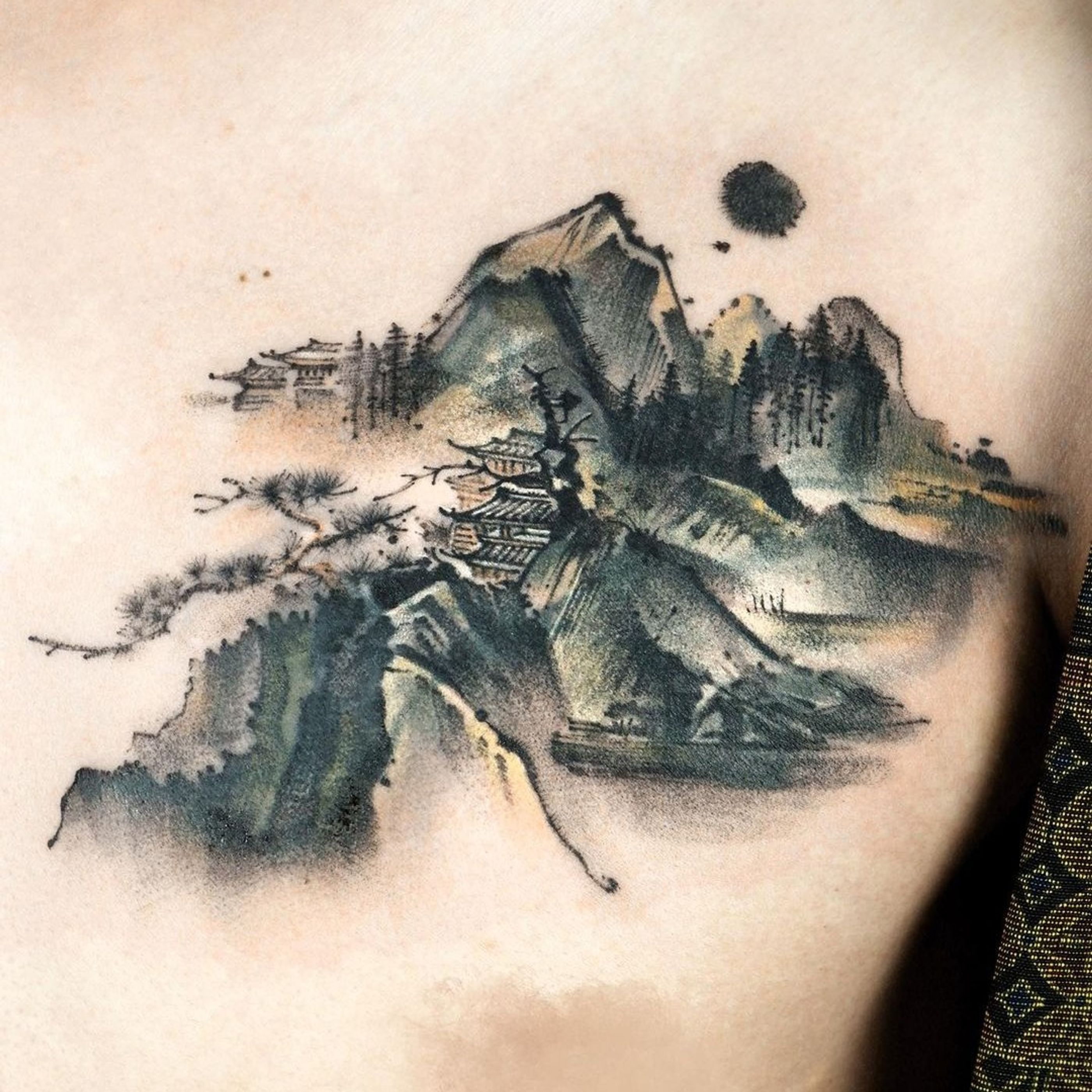 Painterly tattoo by Ati #Ati #tattooistati #koreanart #koreantattoo #koreantattooist #painterly #fineart #landscape #pagoda #mountain #nature