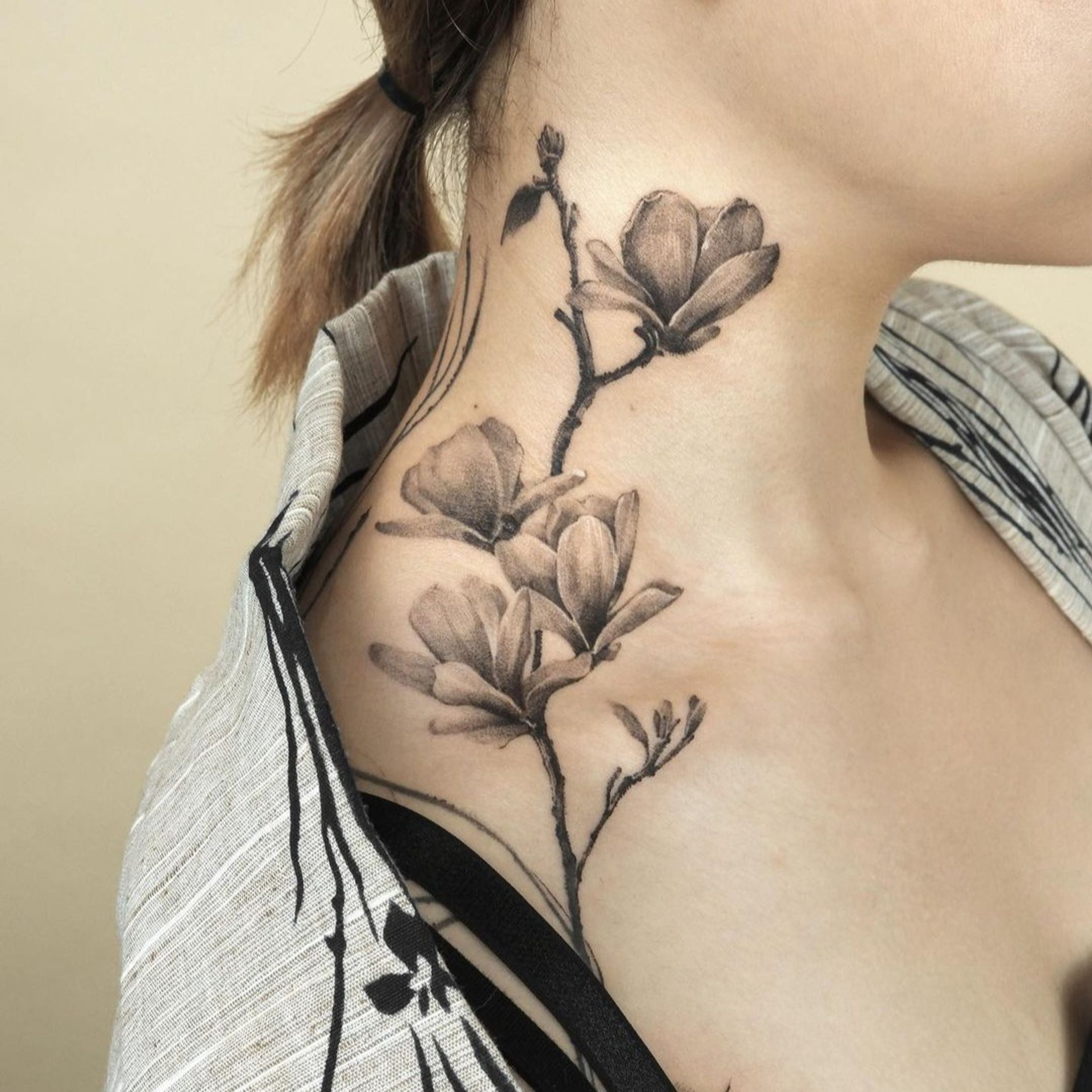 Painterly tattoo by Ati #Ati #tattooistati #koreanart #koreantattoo #koreantattooist #painterly #fineart #flower #neck