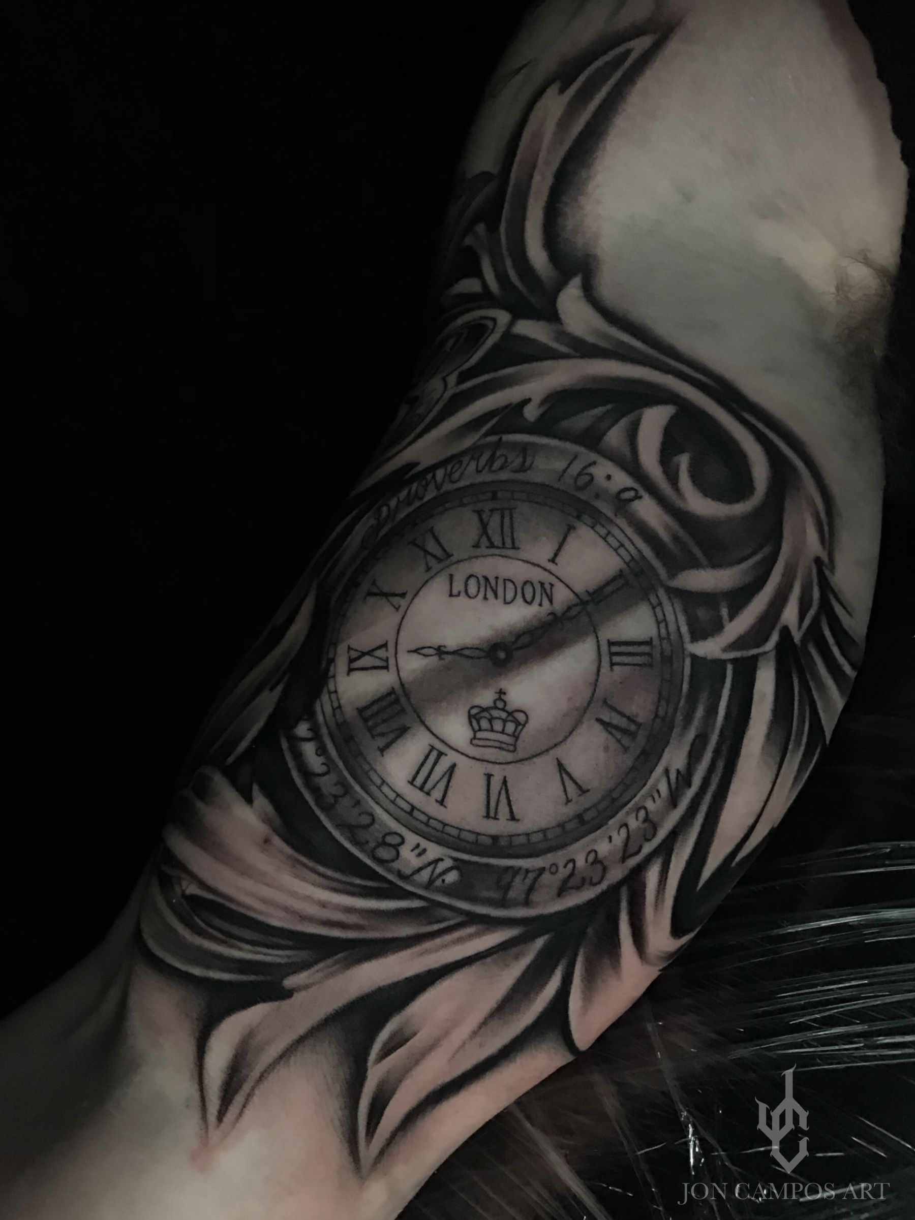 Black and grey clock and filigree tattoo done by Jon campos art. Arlington, Tx.
